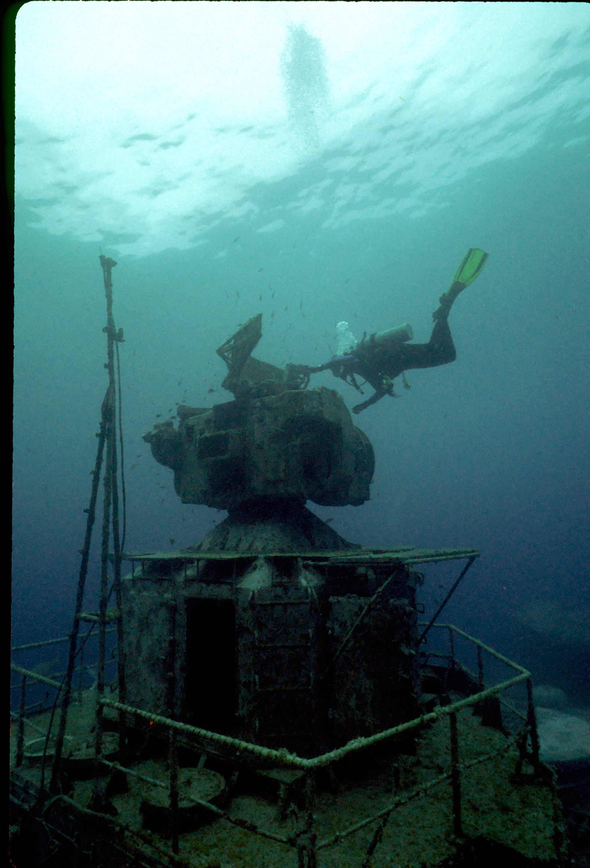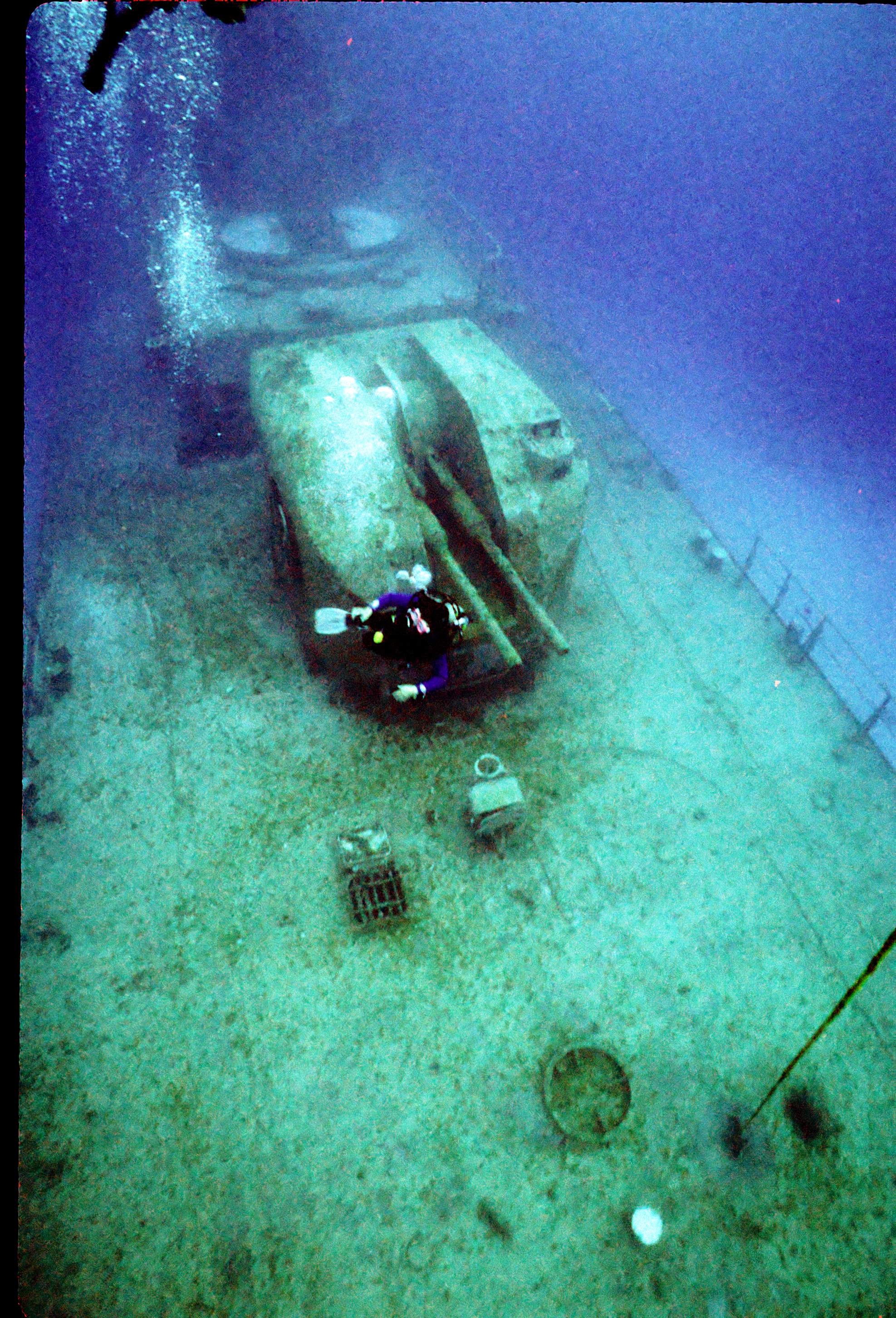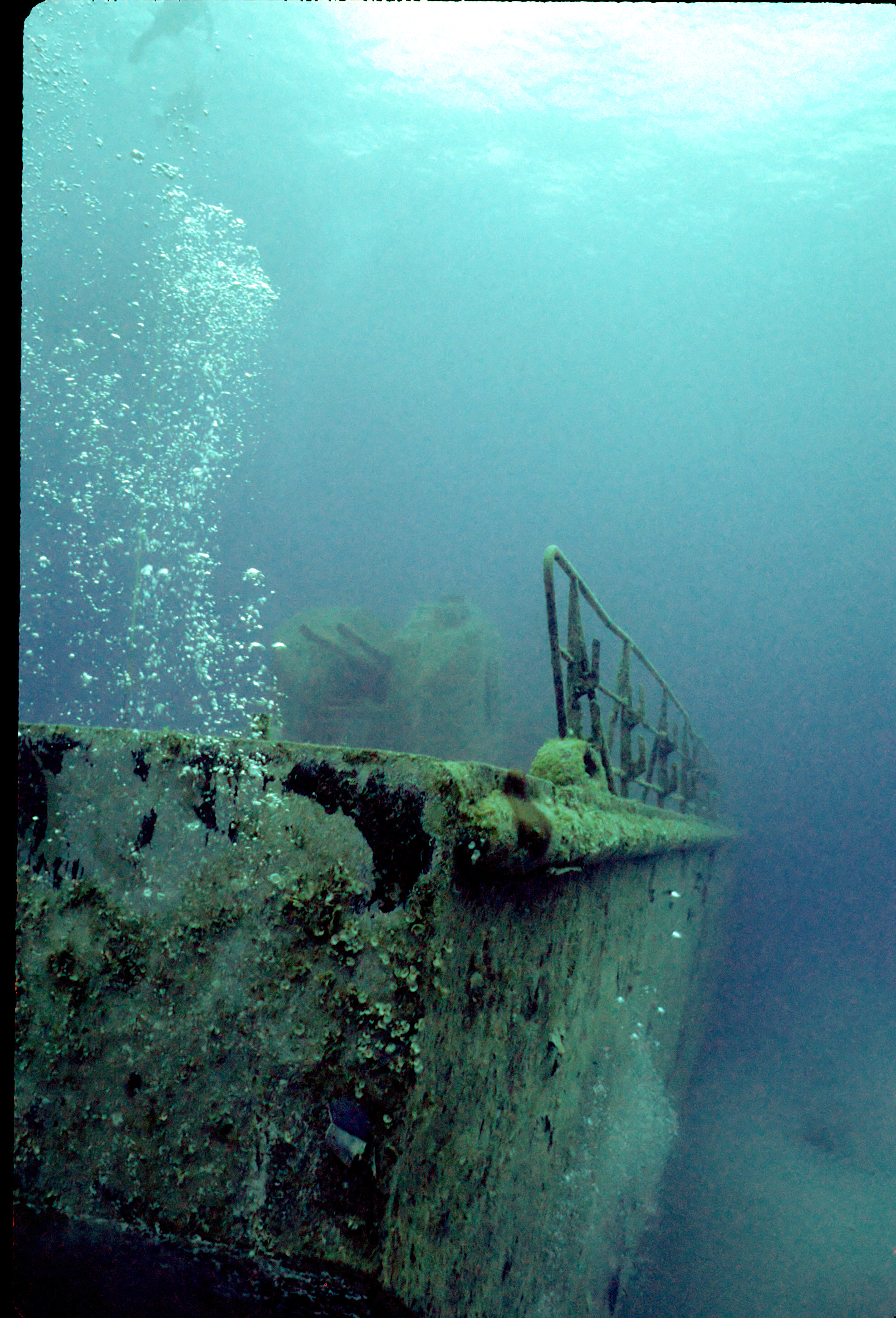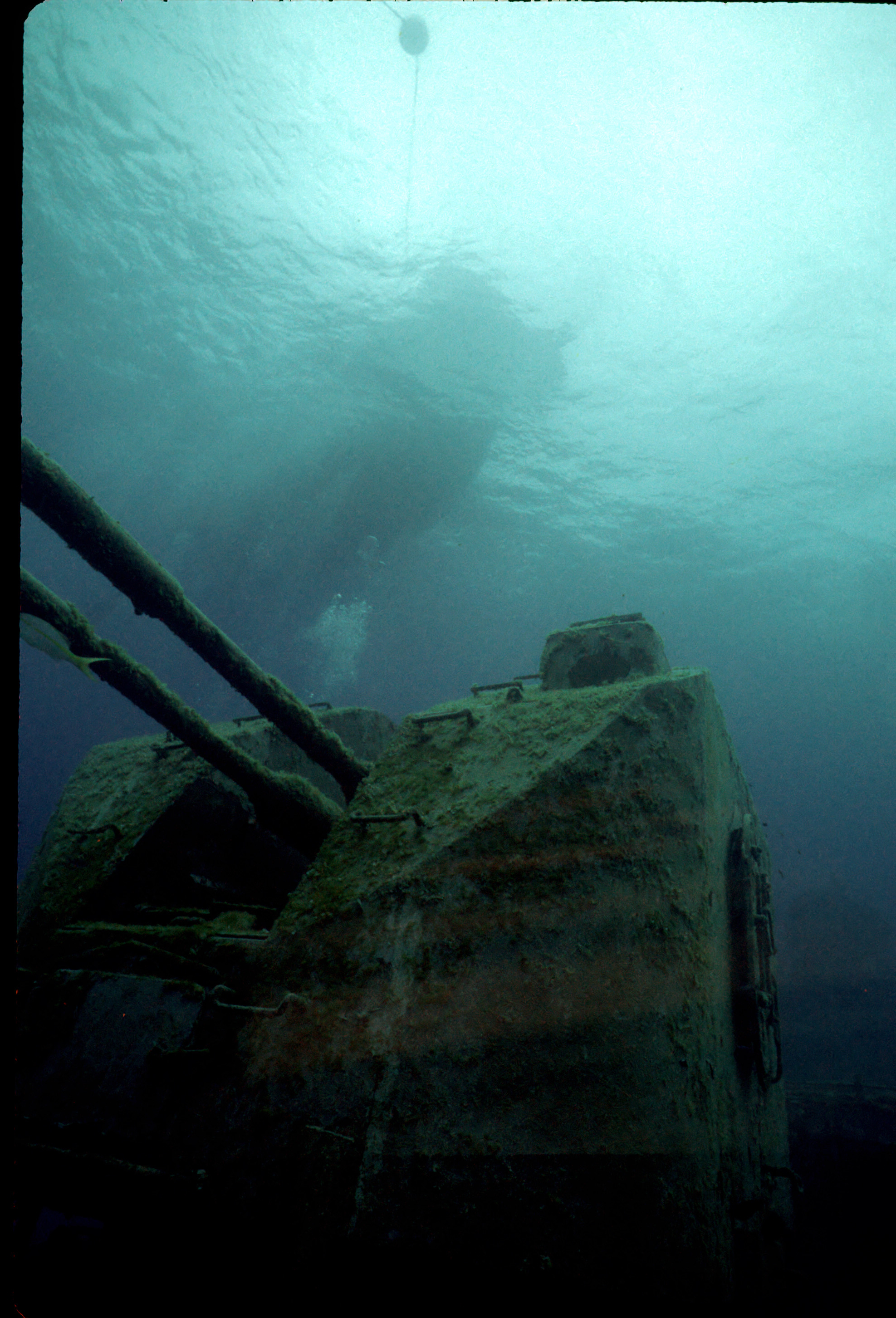 Dive buddy Rob Schlamowitz. Nikonos V, 15 mm lens, single Ikelite Ai storbe. Sensia 200 film. This had recently been sunk as a dive site. Very interesting. /hughClick a photo to view or click first photo to see a slide show.