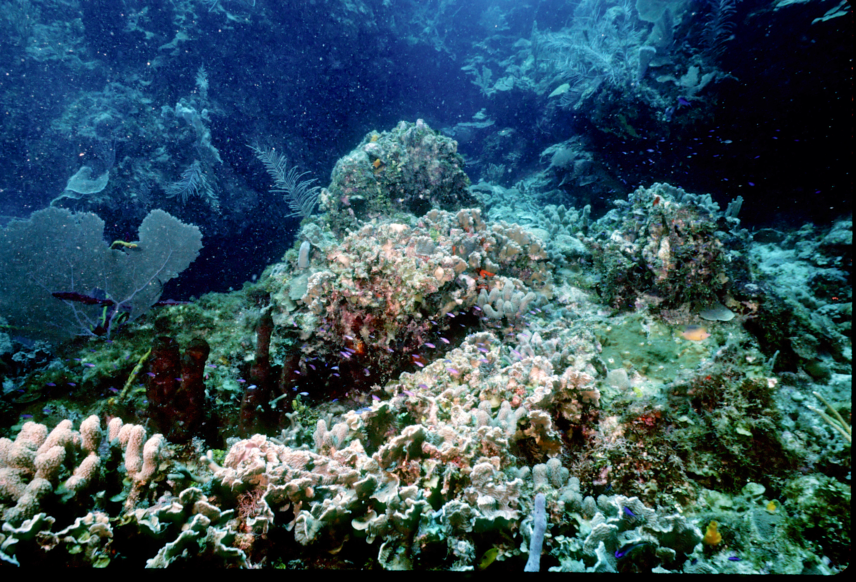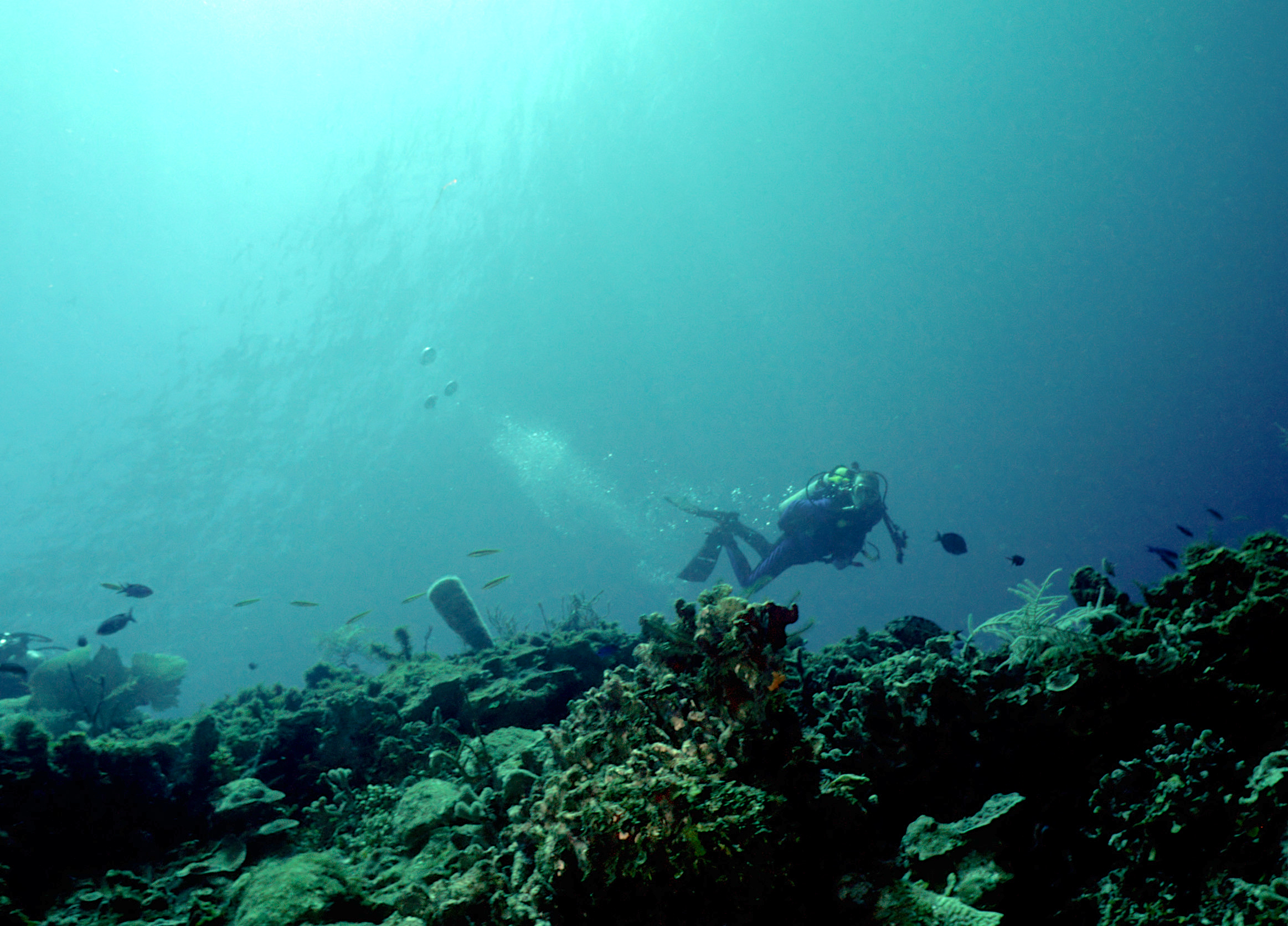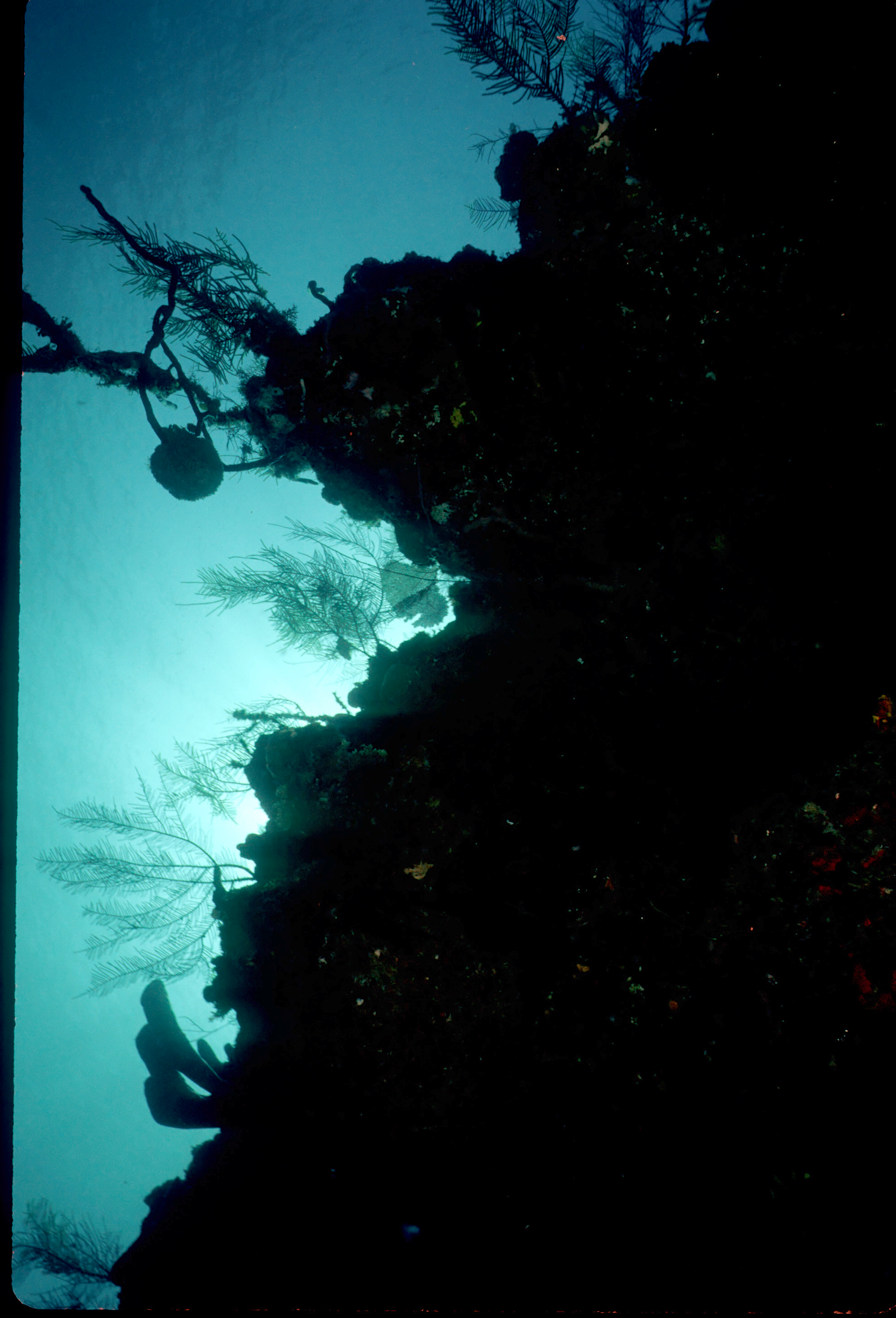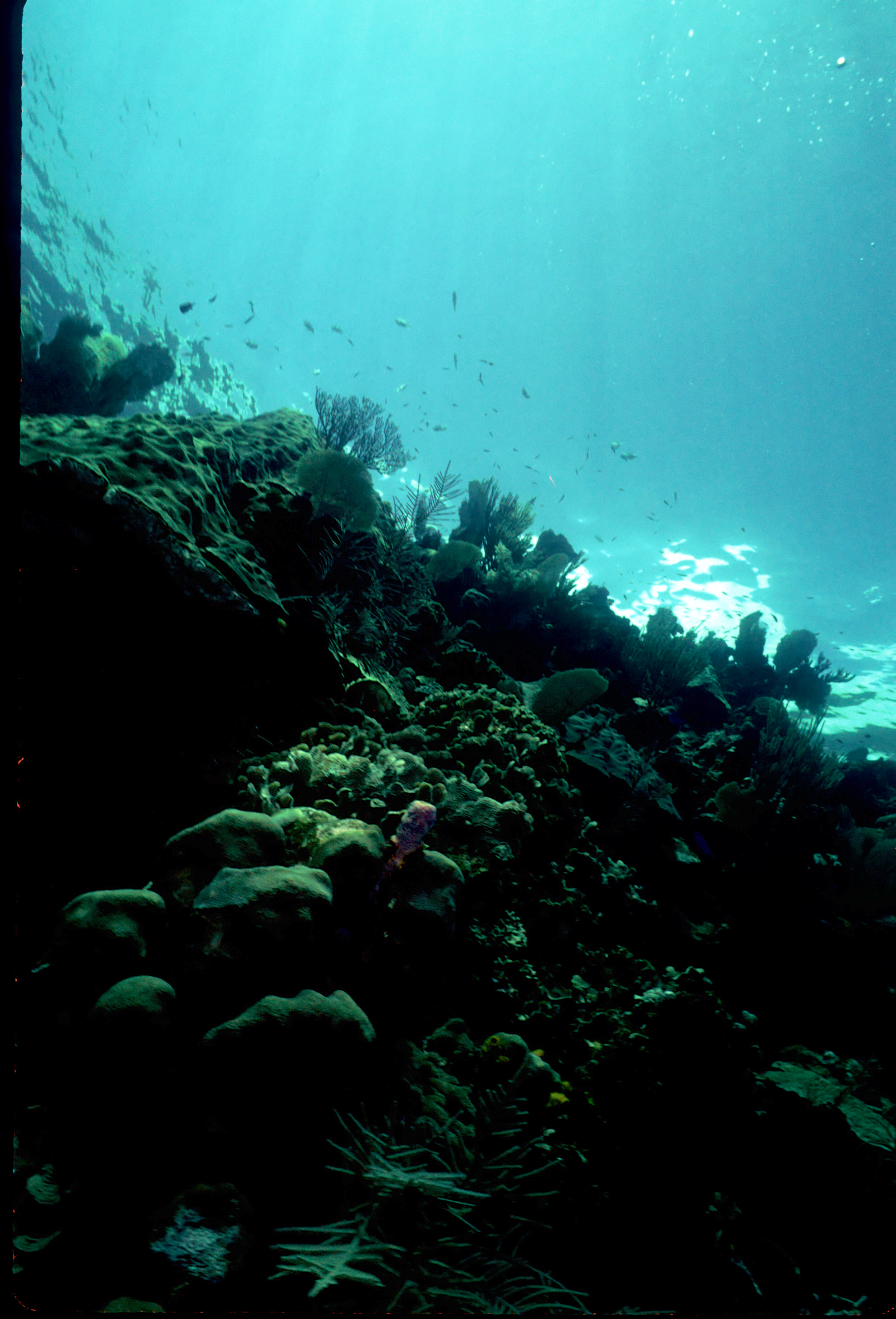 Dive buddies Lori and Trey. Nikonos V, 15 mm lens, single Ikelite Ai storbe. Velvia 50 film. Two dives at this site. We saw a corallimorph and a cleaner shrimp on a vase sponge. A beautiful day! /hugh