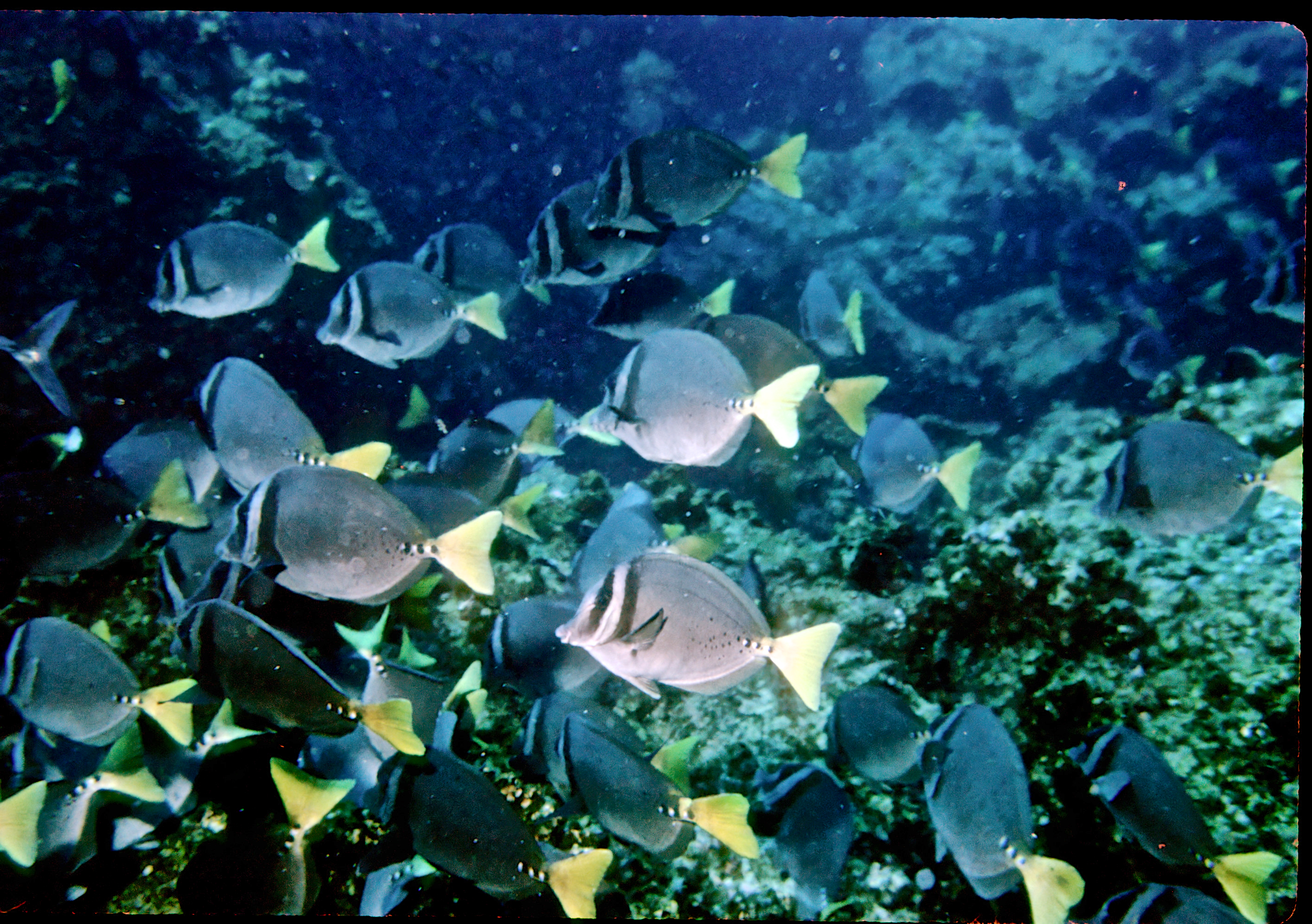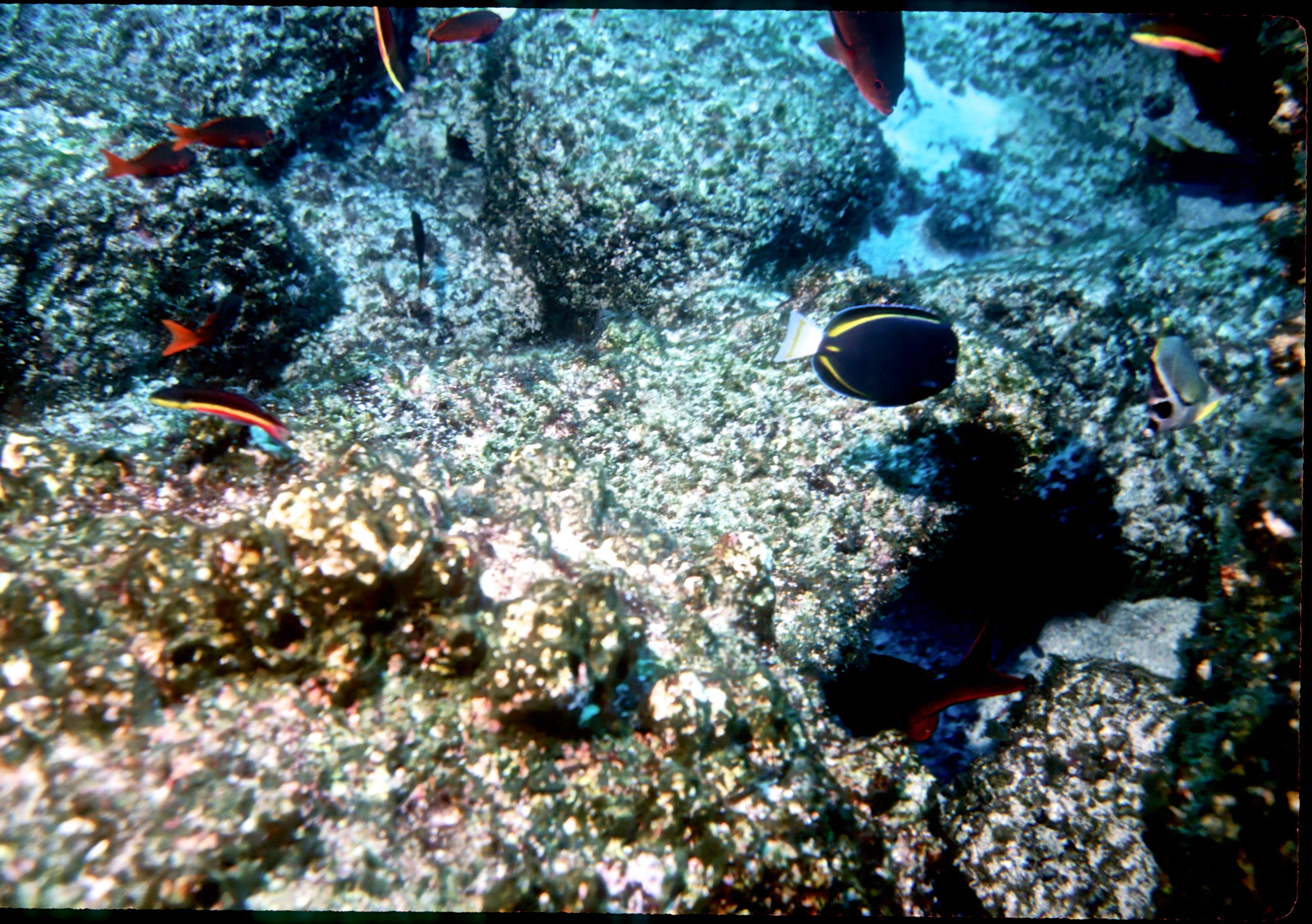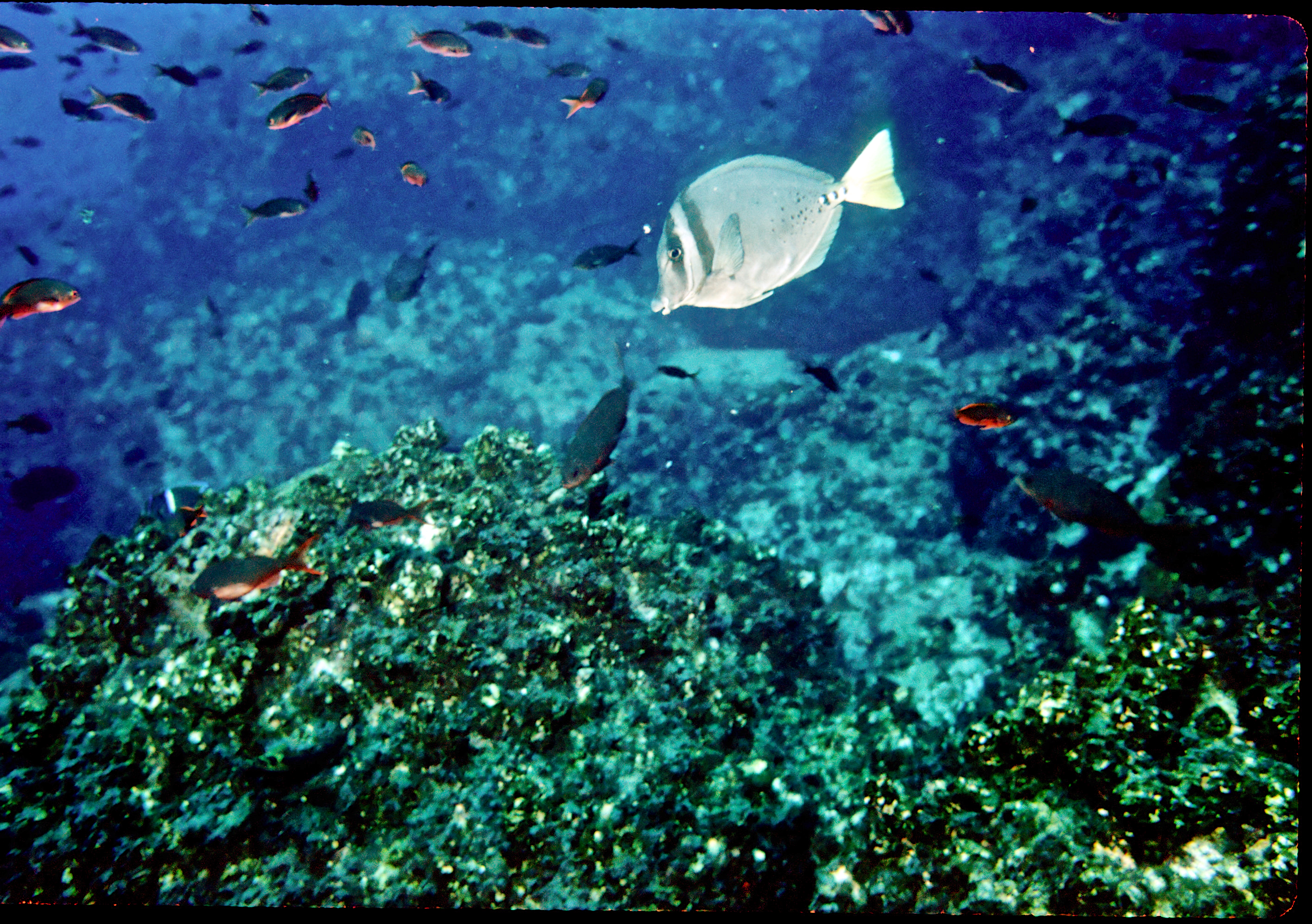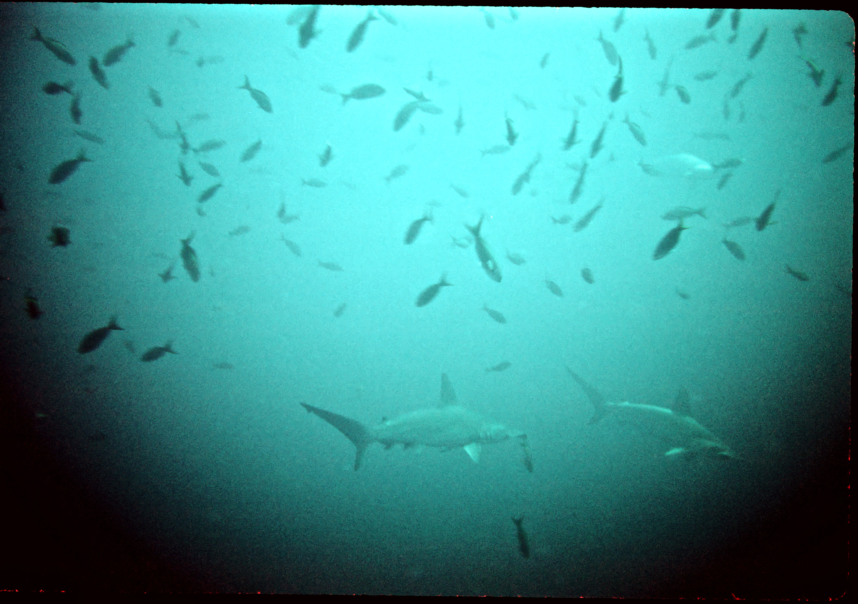 Nkonos V camera, 35mm lens, Velvia 50 slide film, single Ikelite Ai strobe, solo. From the wall along Wolf Island we swam out over a pinnacle to see sharks circling in the depths below. This was a common site around Wolf and Darwin Islands. /hughClick a photo to view or click first photo to see a slide show.