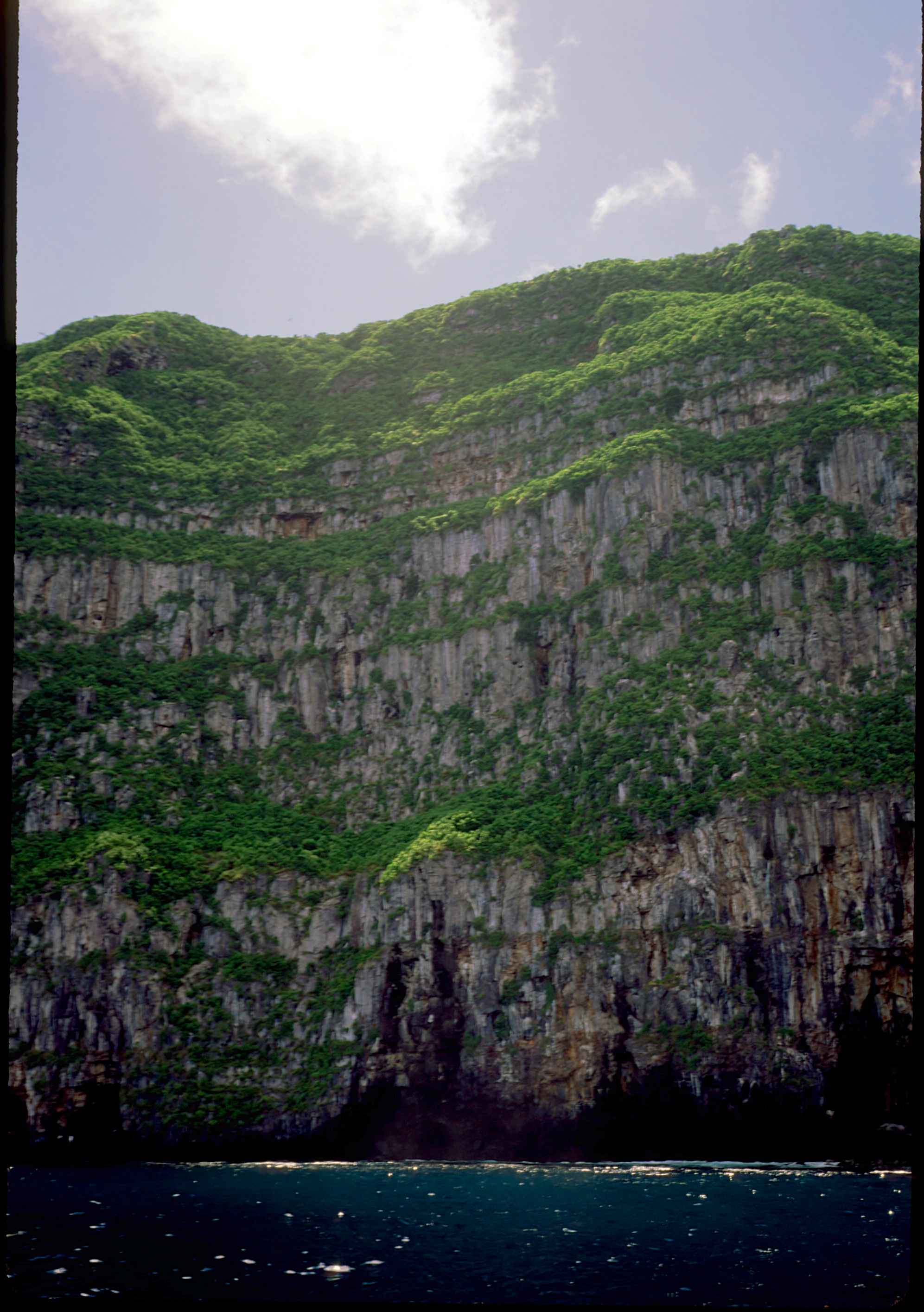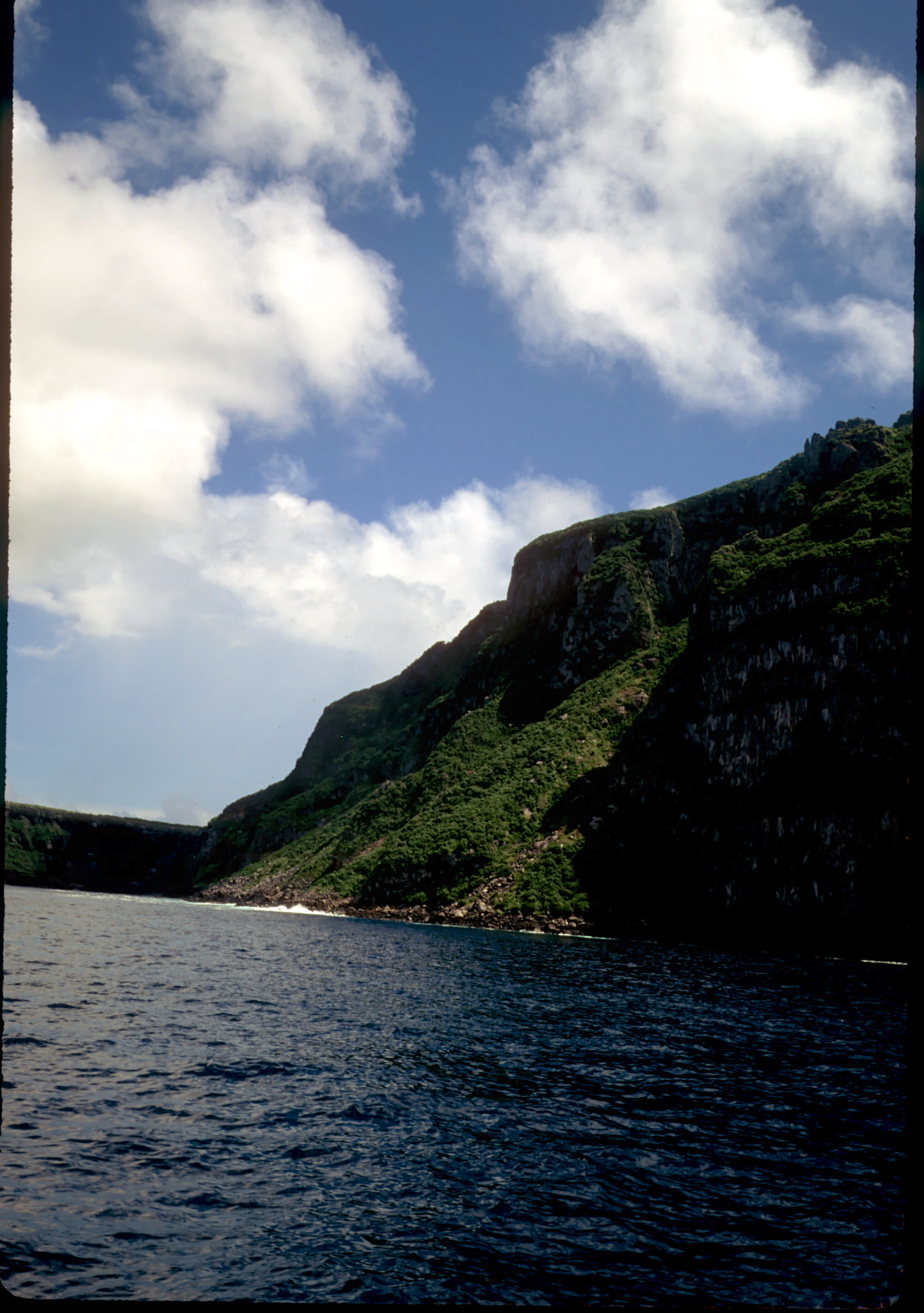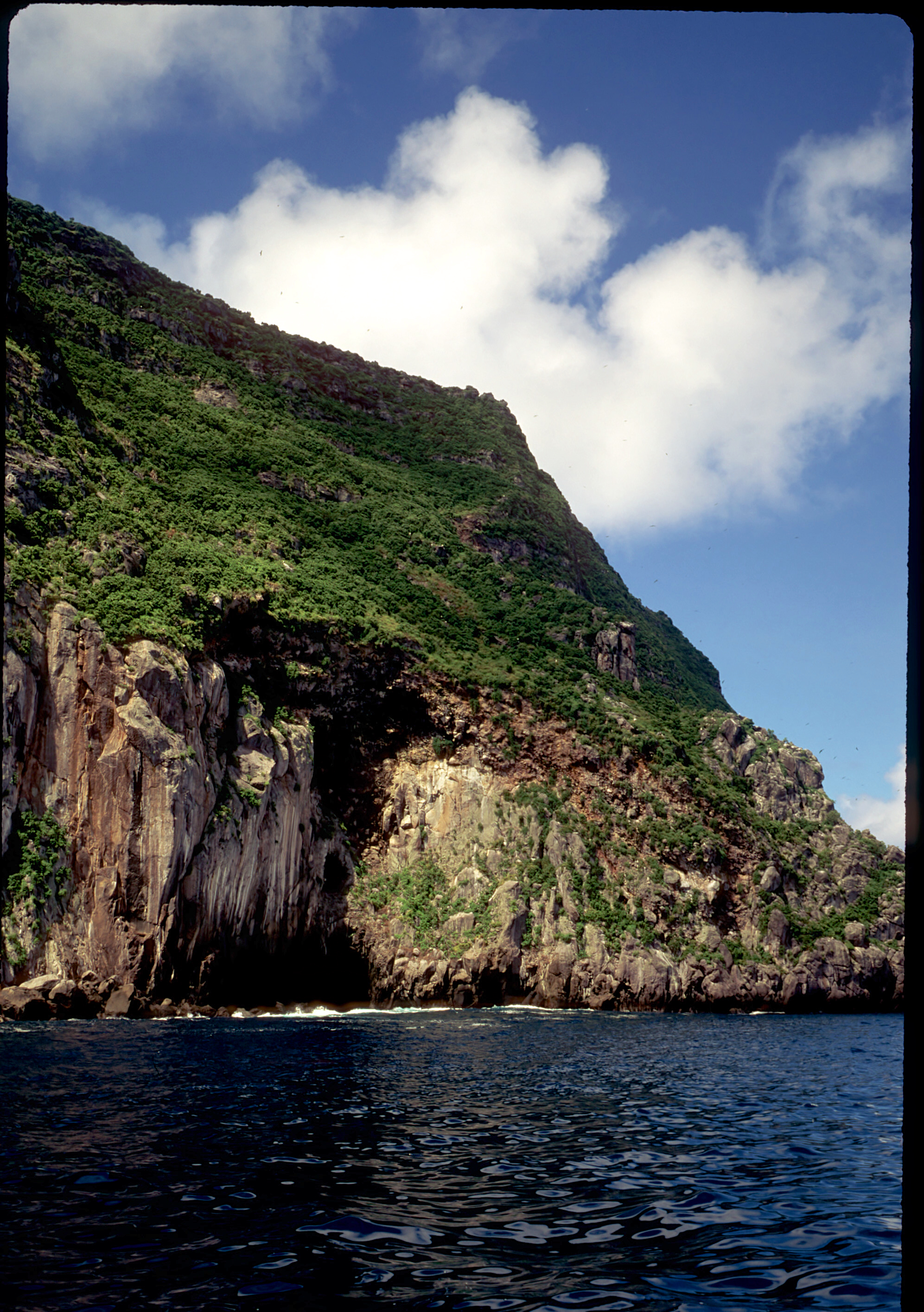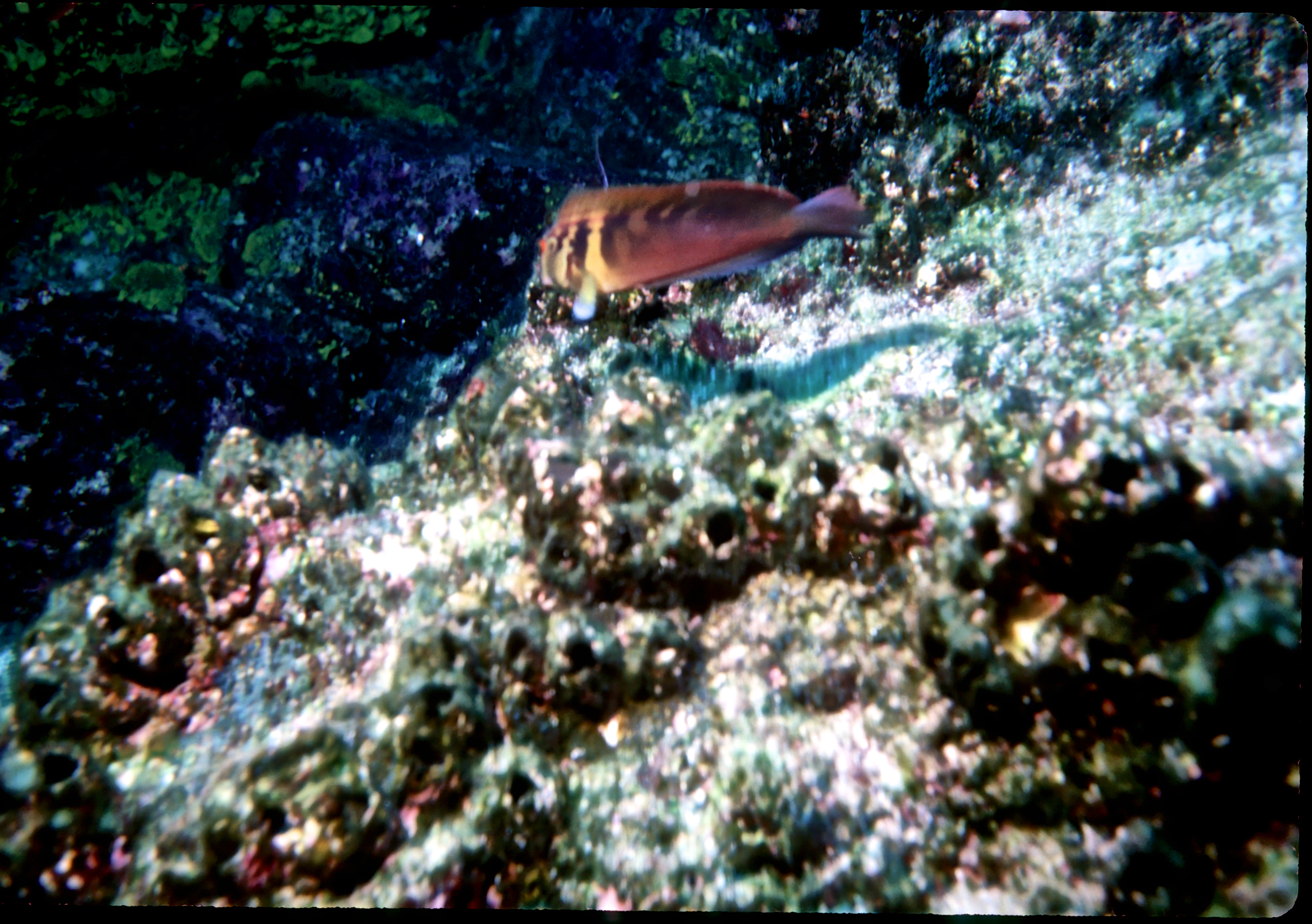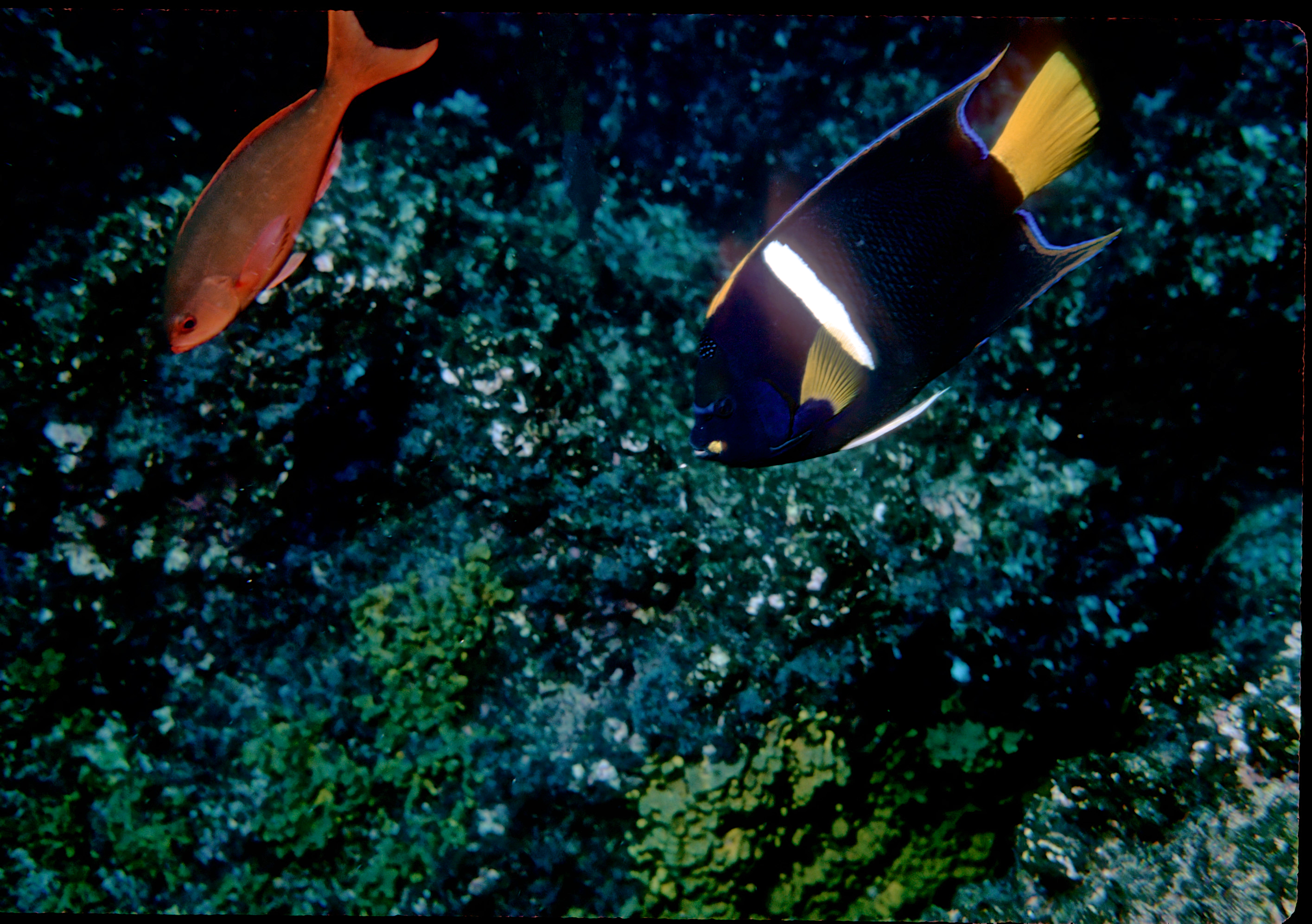 Nkonos V camera, 35mm lens, Velvia 50 slide film, single Ikelite Ai strobe, solo. From the wall along Wolf Island we swam out over a pinnacle to see sharks circling in the depths below. This was a common site around Wolf and Darwin Islands. /hughClick a photo to view or click first photo to see a slide show.