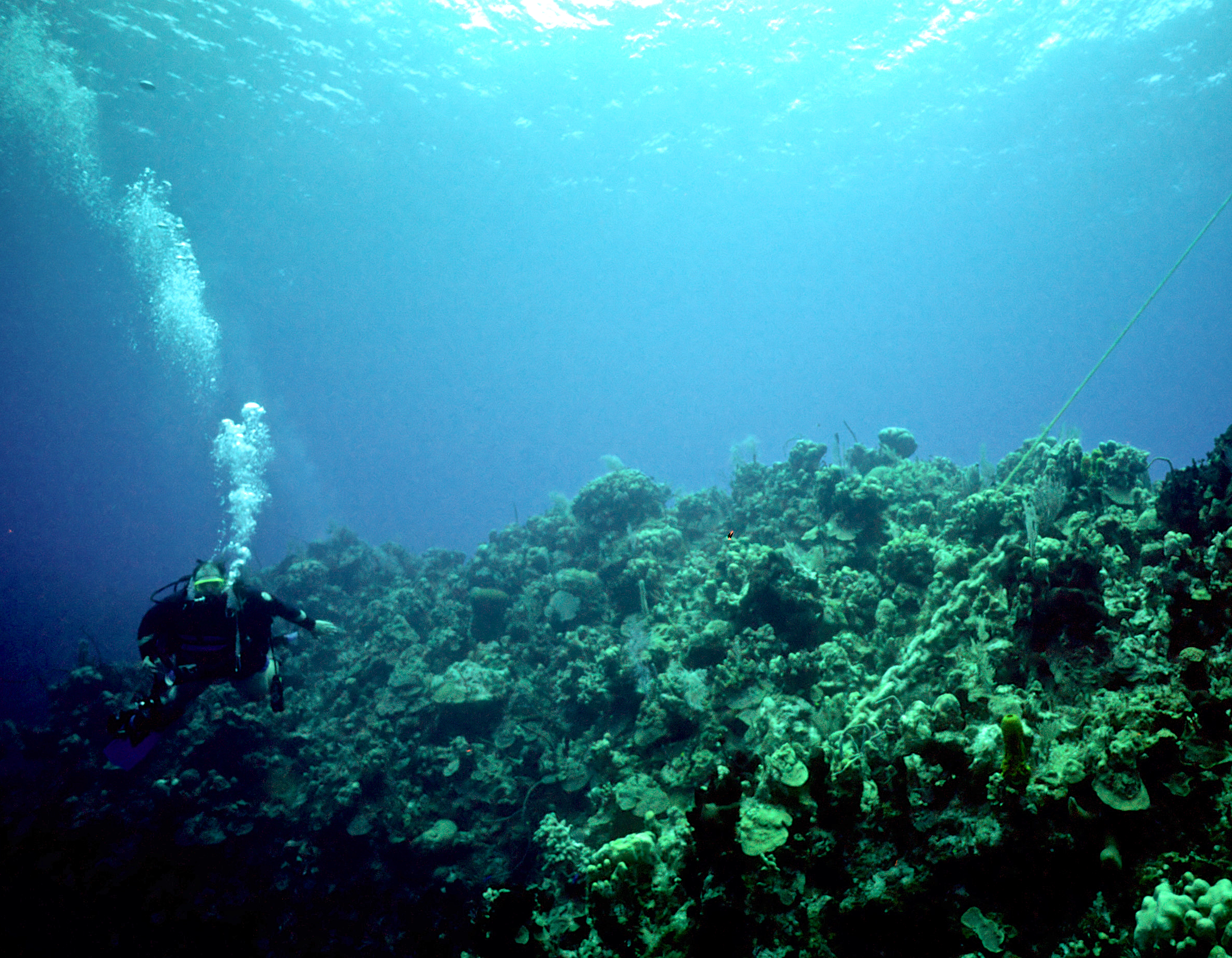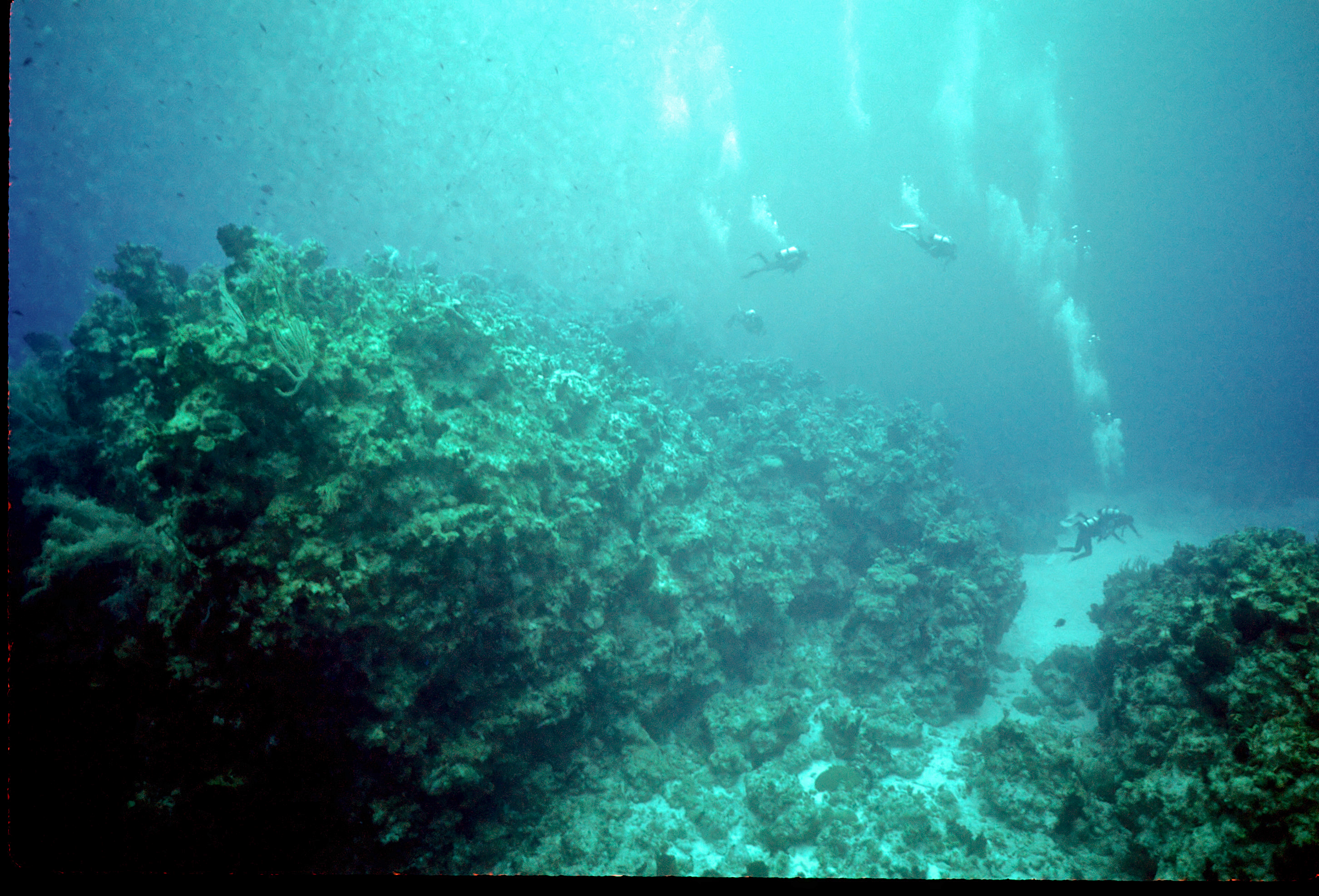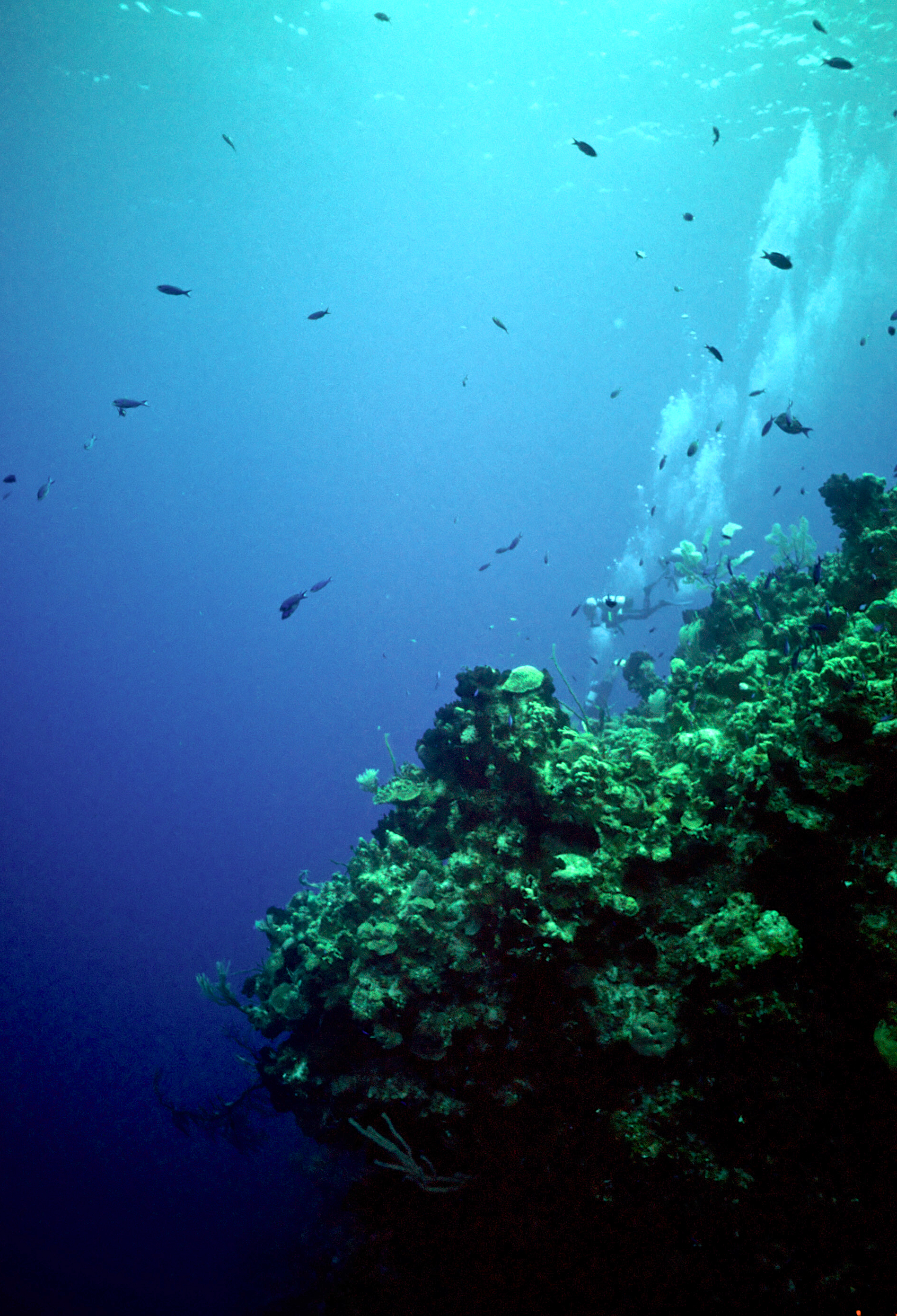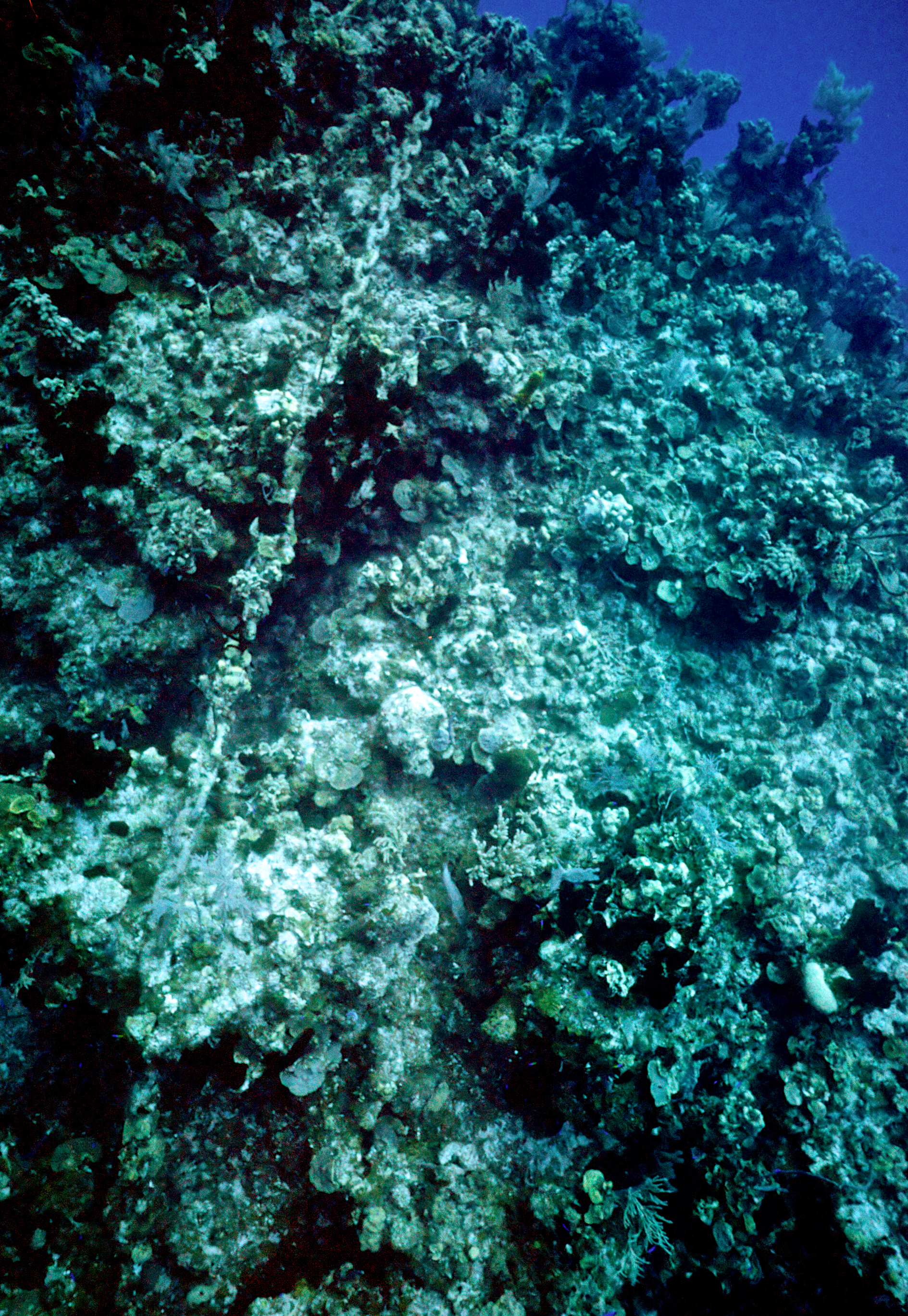 Dive # 91, Nikonos V, 15mm lens closeup, Fujichrome Velvia 50 slide film, dive buddies Herb Seegers and Lori. We started the dive on one of the pinnacles and I got a keeper-shot of the anchor chain. Then we went to the edge of the wall and saw a wrasse ass bass and later a hammerhead swimming in the depths below. I saw several juveniles I had never seen previously. These were pointed out by the knowledgeable Herb Seegers who gave us excellent photo instruction. I did 76ft for 47min. Lori did 120ft for 29min. /hughClick a photo to view or click first photo to see a slide show.