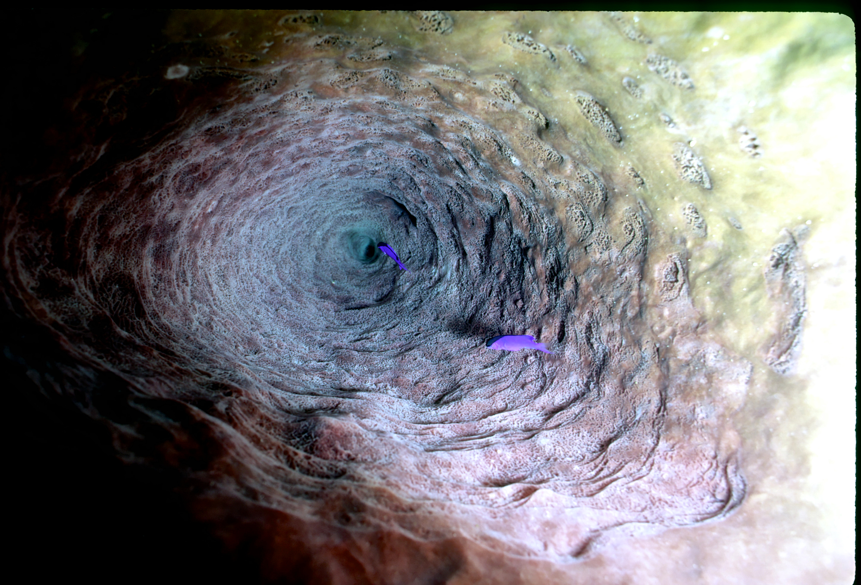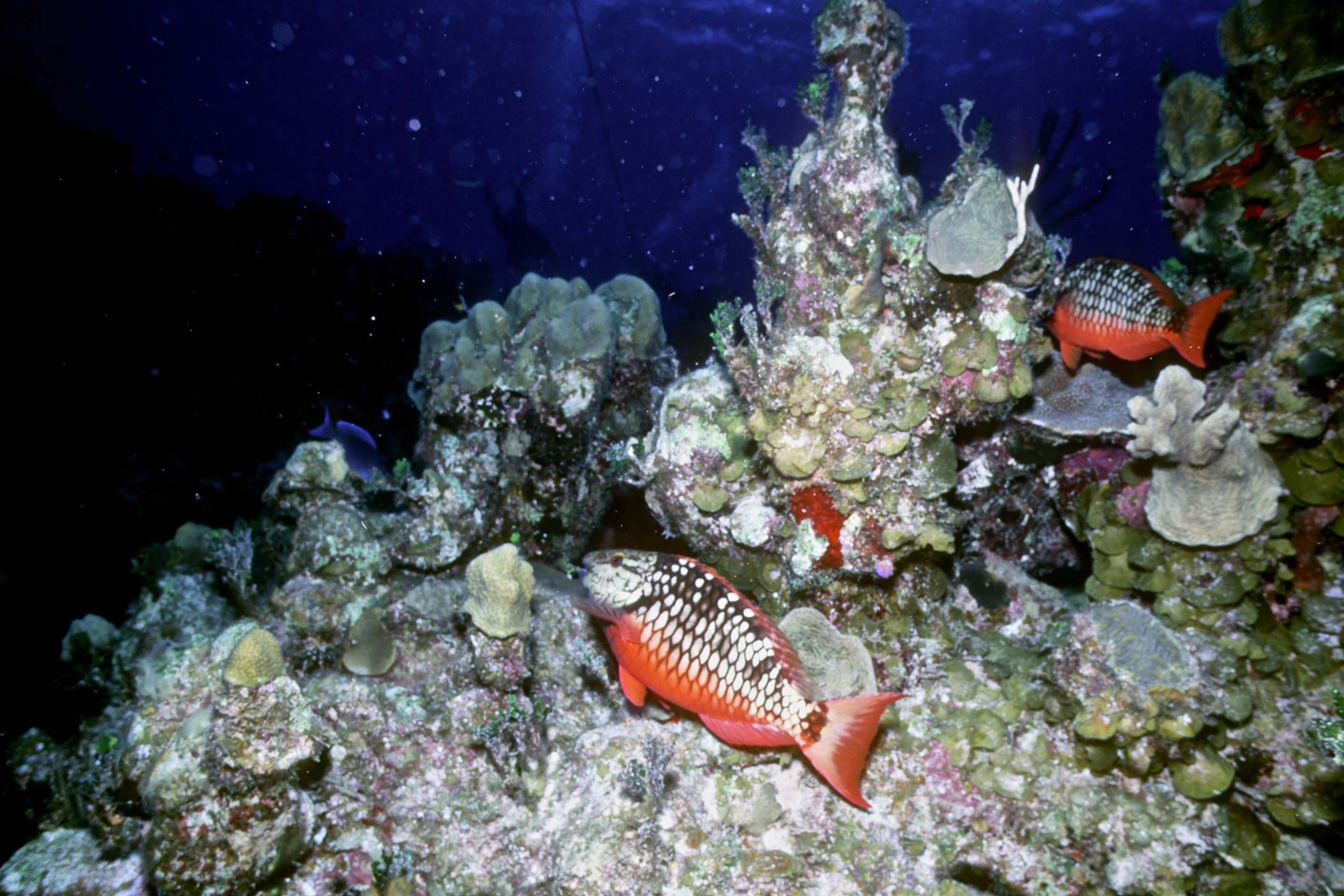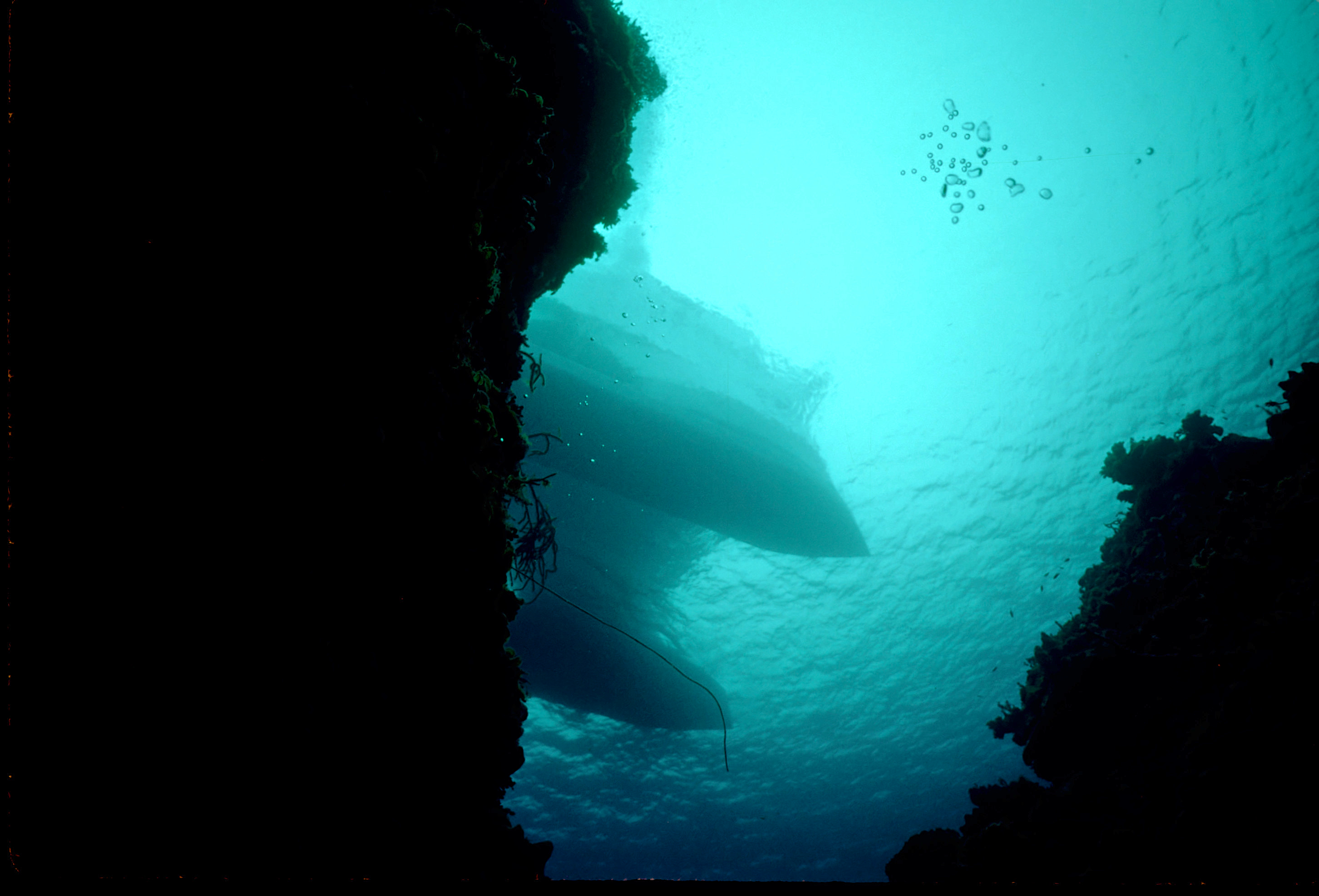 Dive # 91, Nikonos V, 15mm lens closeup, Fujichrome Velvia 50 slide film, dive buddies Herb Seegers and Lori. We started the dive on one of the pinnacles and I got a keeper-shot of the anchor chain. Then we went to the edge of the wall and saw a wrasse ass bass and later a hammerhead swimming in the depths below. I saw several juveniles I had never seen previously. These were pointed out by the knowledgeable Herb Seegers who gave us excellent photo instruction. I did 76ft for 47min. Lori did 120ft for 29min. /hughClick a photo to view or click first photo to see a slide show.