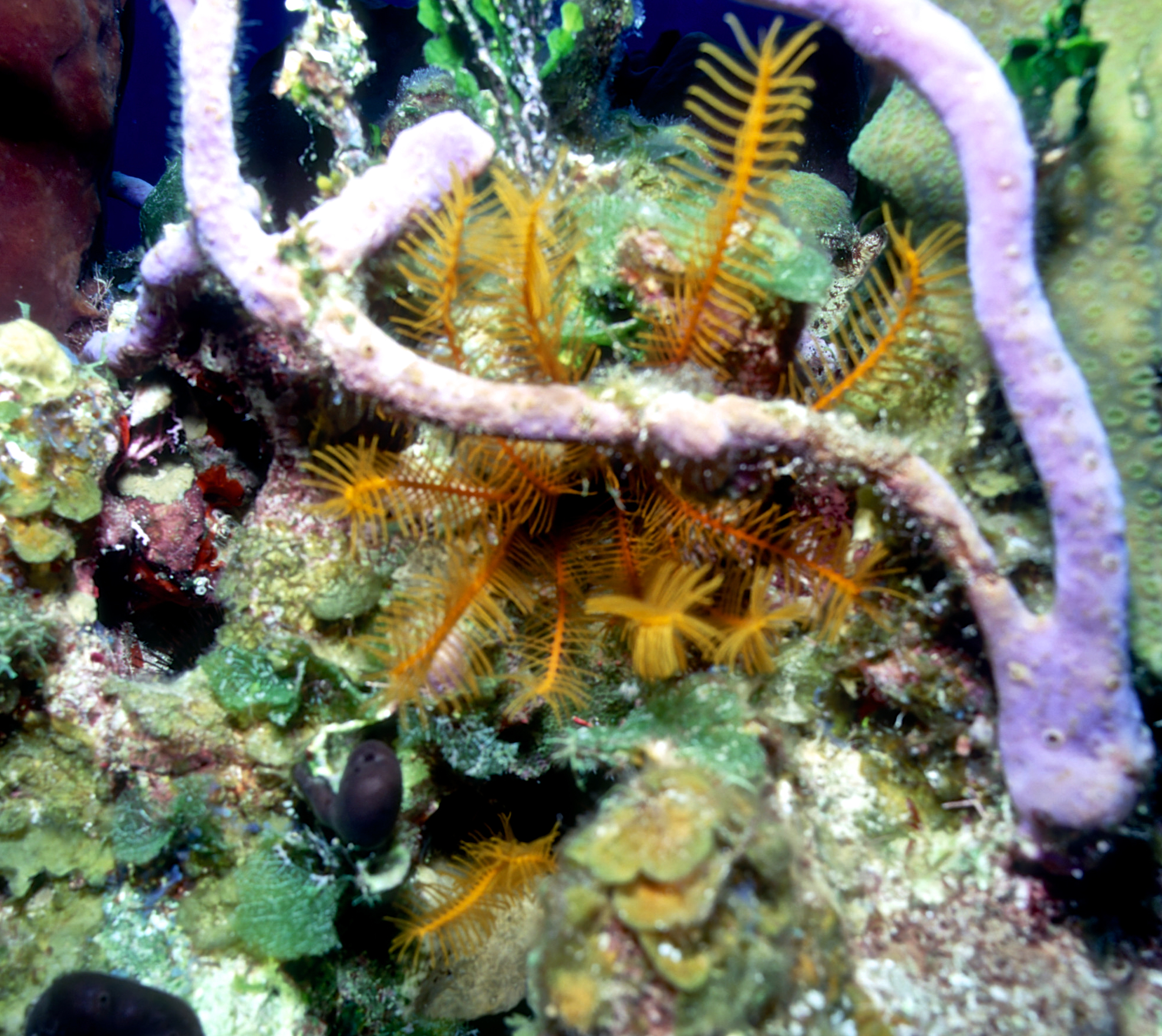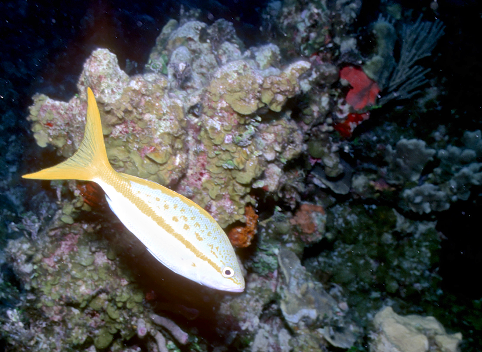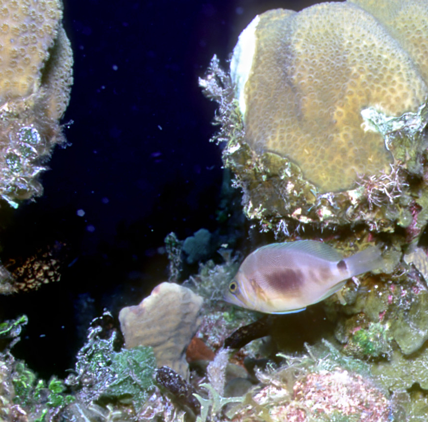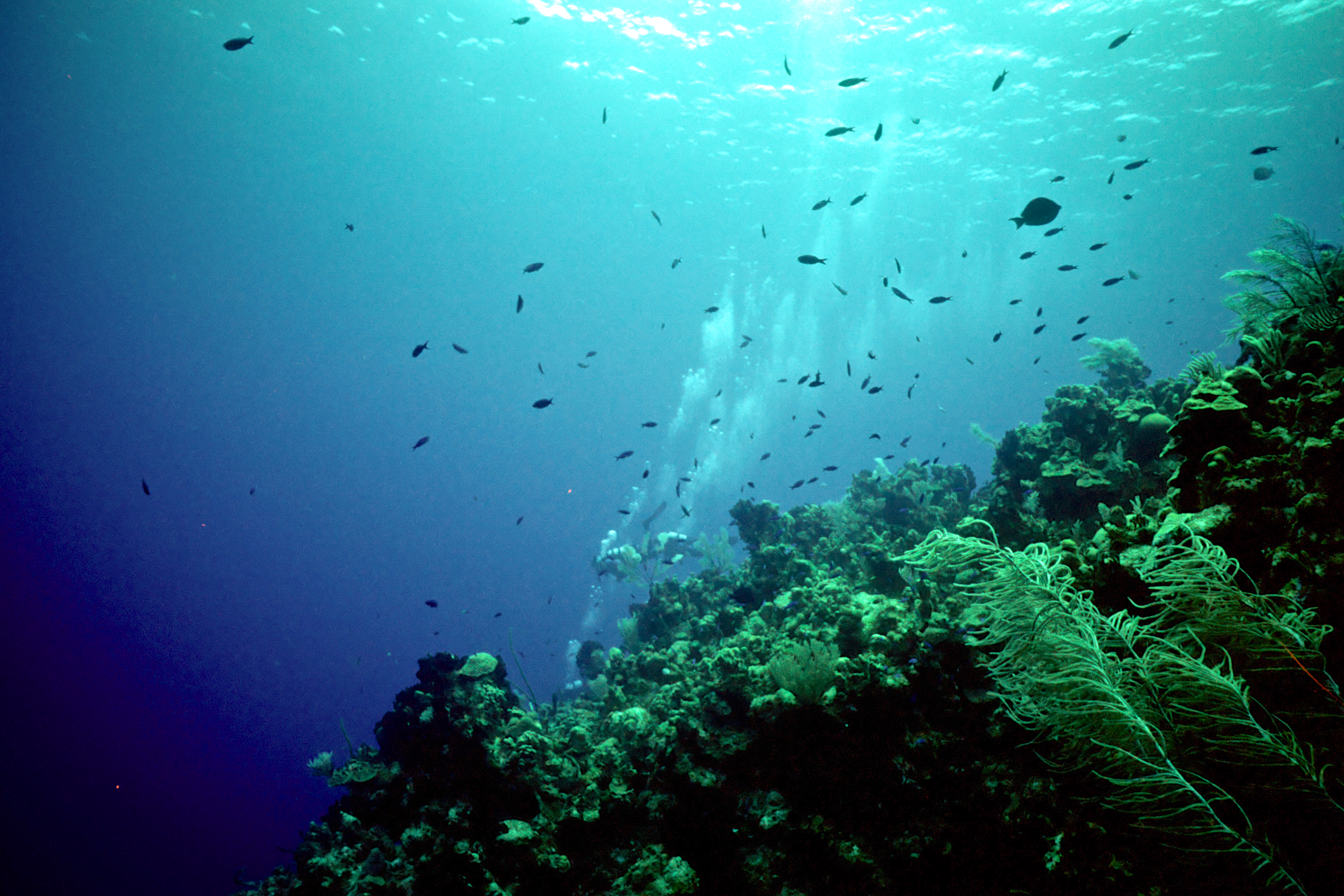 Dive # 91, Nikonos V, 15mm lens closeup, Fujichrome Velvia 50 slide film, dive buddies Herb Seegers and Lori. We started the dive on one of the pinnacles and I got a keeper-shot of the anchor chain. Then we went to the edge of the wall and saw a wrasse ass bass and later a hammerhead swimming in the depths below. I saw several juveniles I had never seen previously. These were pointed out by the knowledgeable Herb Seegers who gave us excellent photo instruction. I did 76ft for 47min. Lori did 120ft for 29min. /hughClick a photo to view or click first photo to see a slide show.