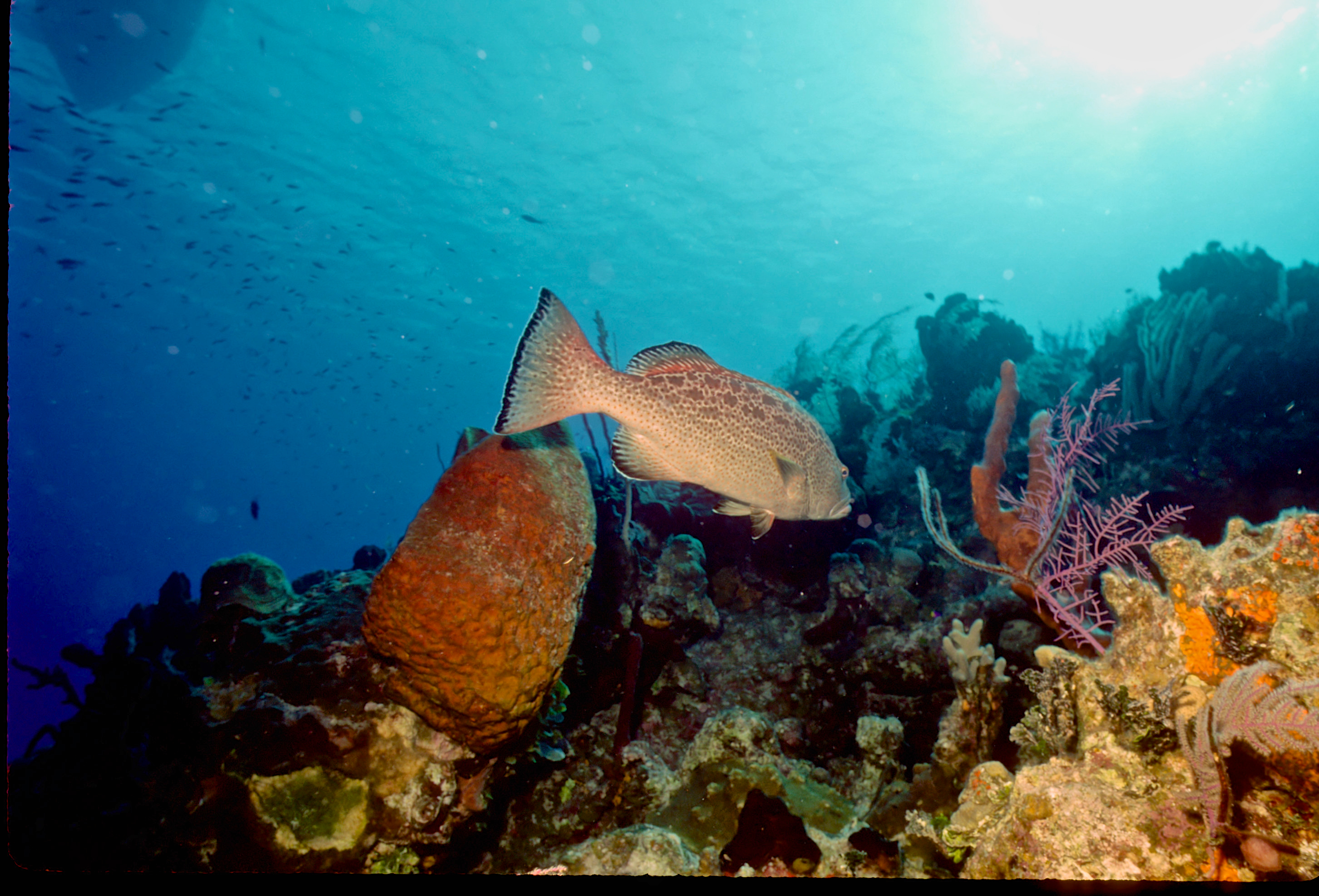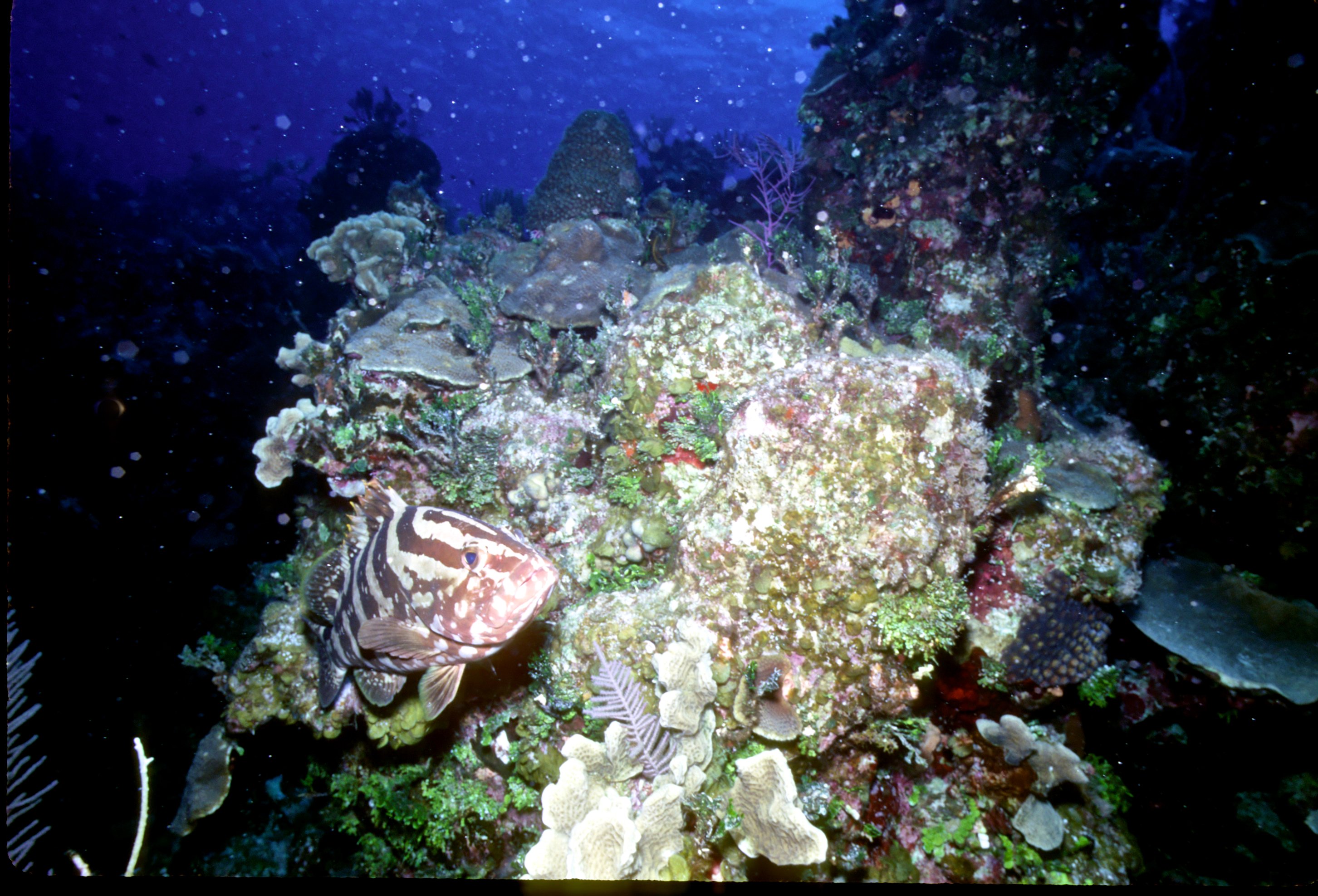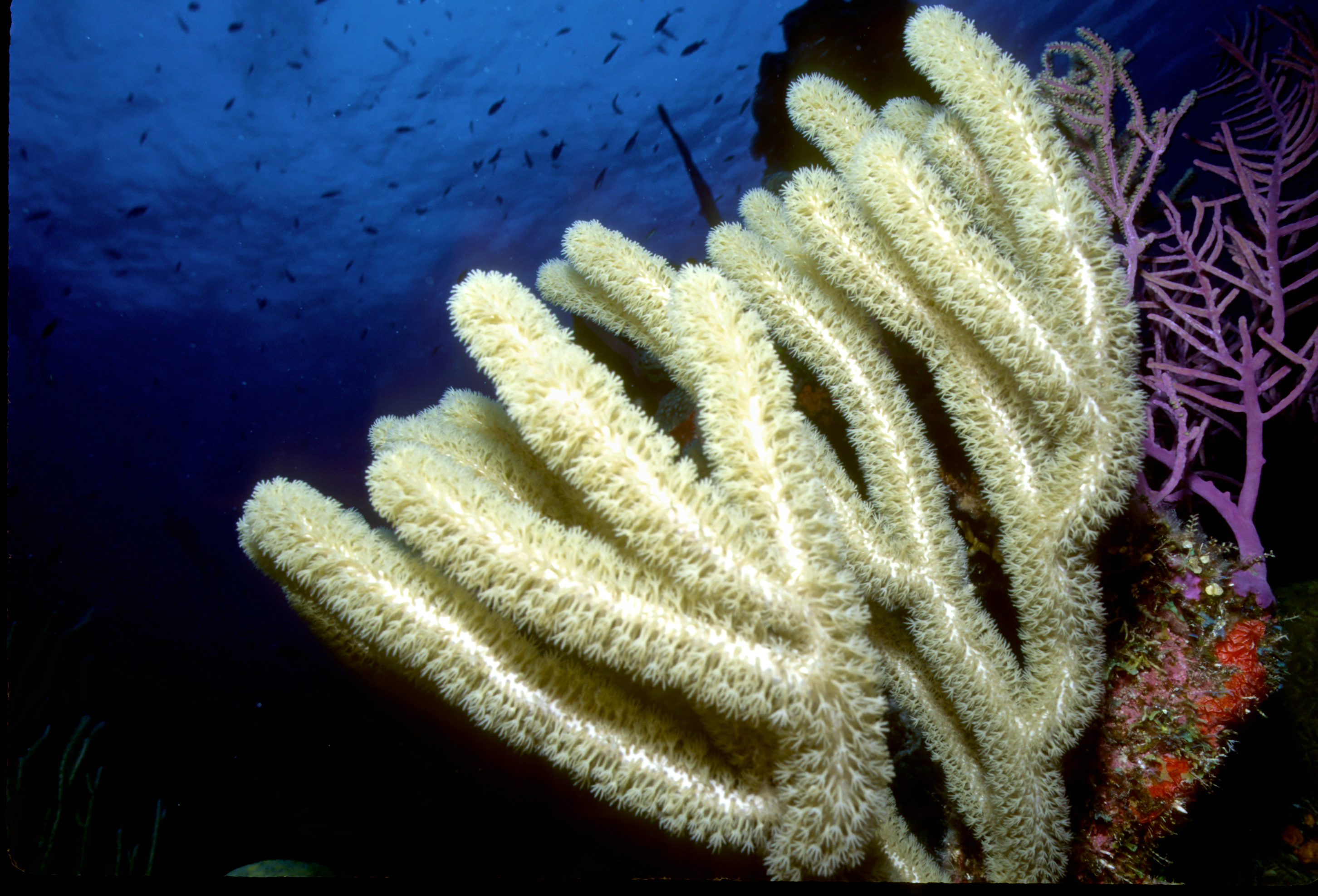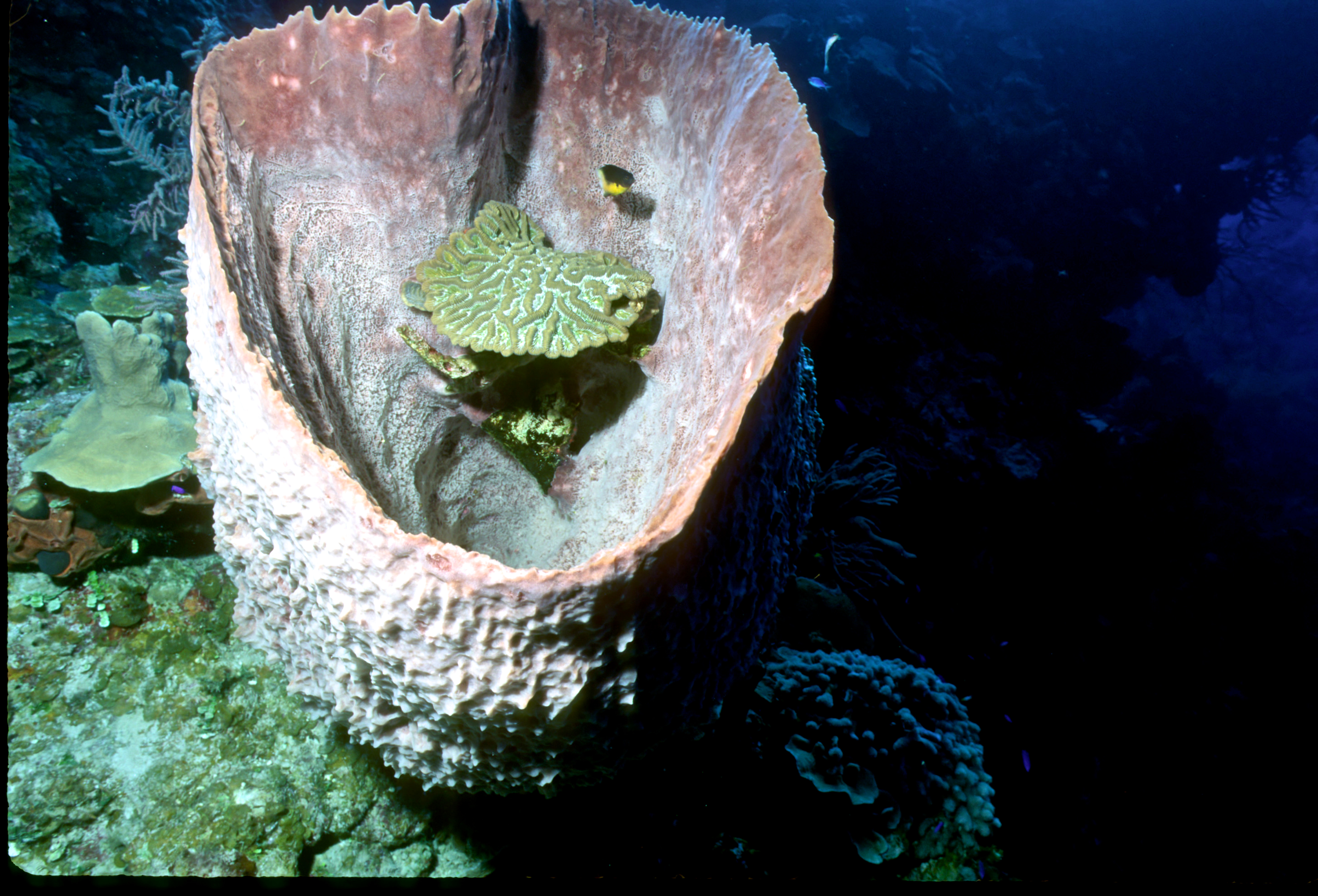 Dive # 93, Nikonos V, 15mm lens closeup, Fujichrome Sensia 100 slide film, dive buddies Herb Seegers and Lori. We saw a lot of garden eels in the sand and found a large vase sponge with coral growing on the inside. 89ft, 40min. Pinnacle and wall dive. /hughClick a photo to view or click first photo to see a slide show.