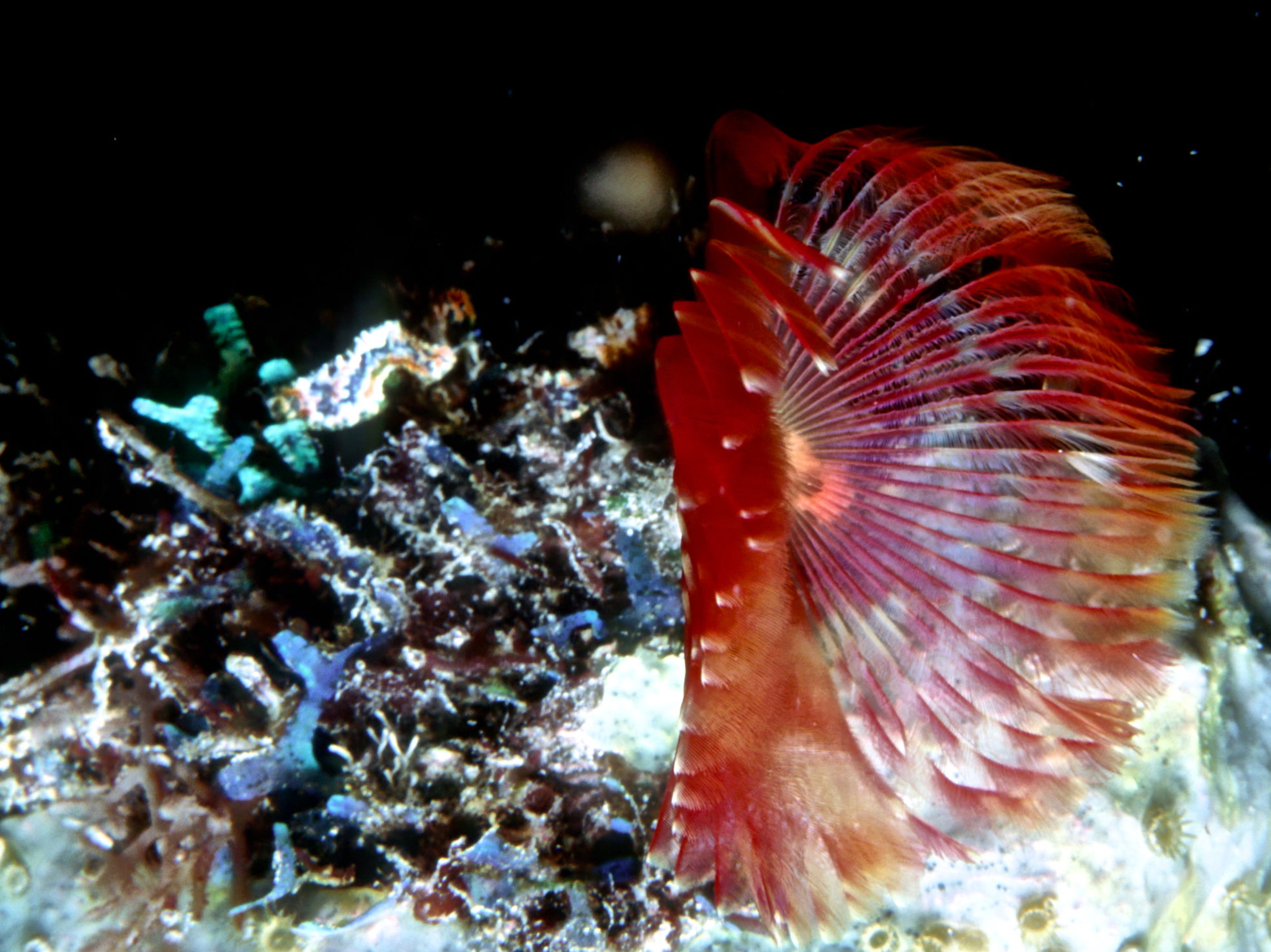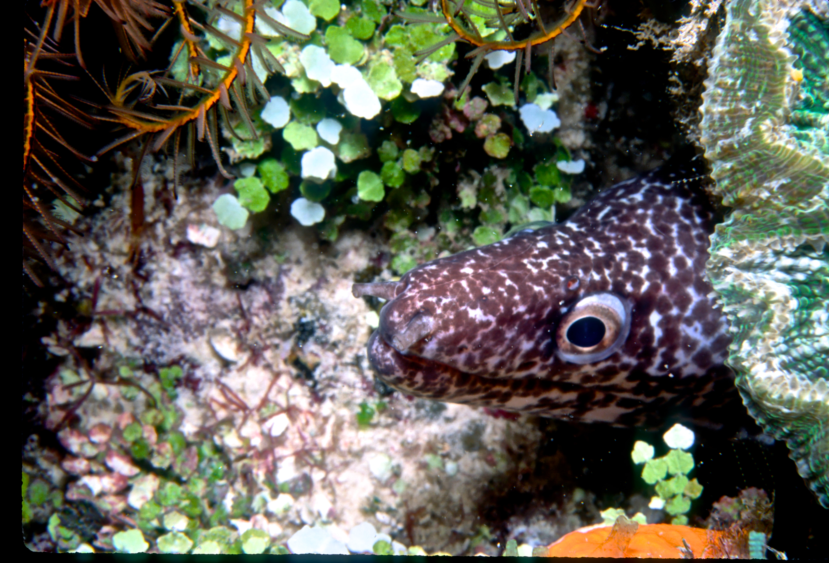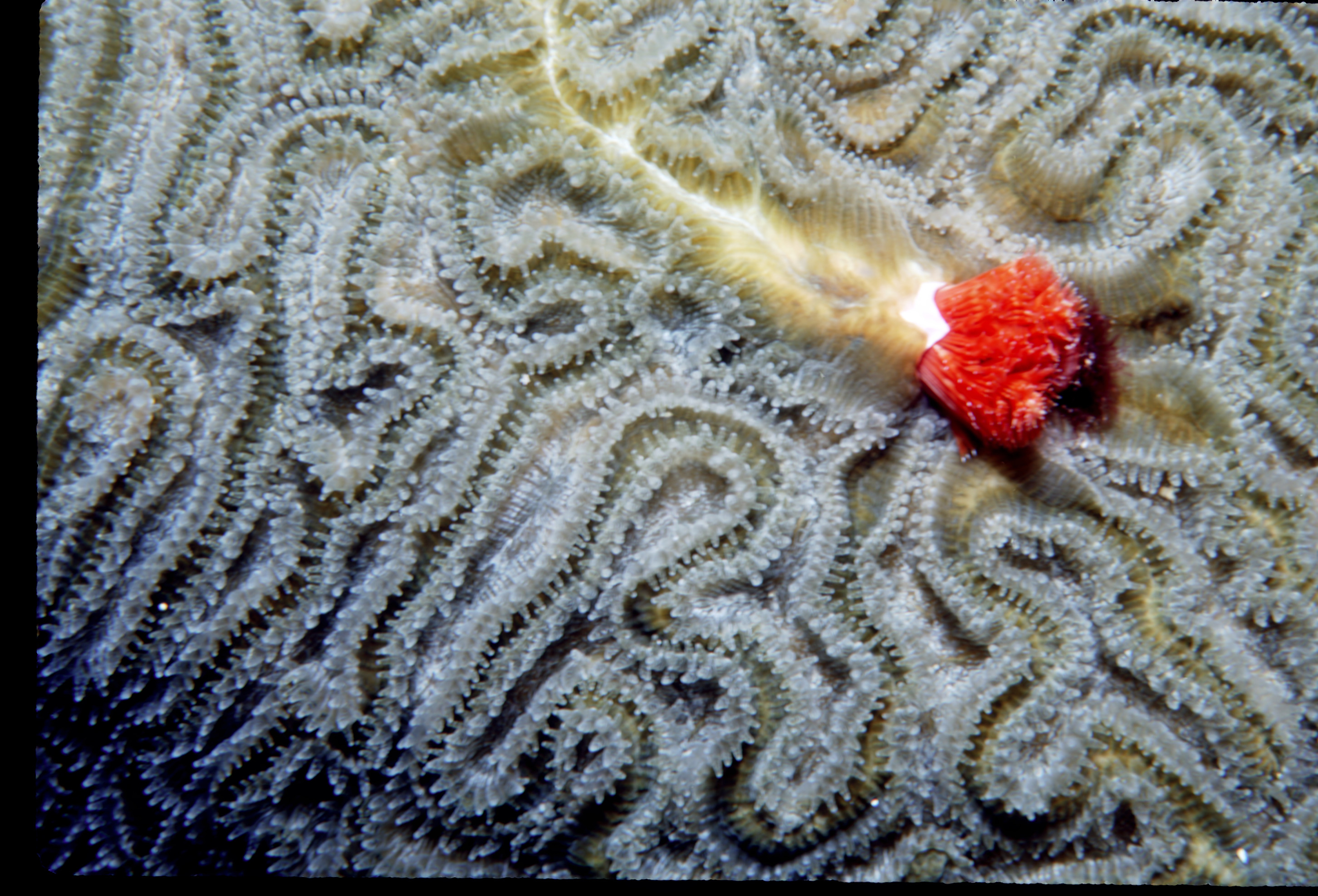 Dive 135. Dive buddy Skip. Nikonos V, 1:2 macro framer, single Ikelite Ai, Velvia 50 film, 35mm lens. Hard dive with surging currents but easy trip back to the boat. 57ft, 50min. /hughClick a photo to view or click first photo to see a slide show.