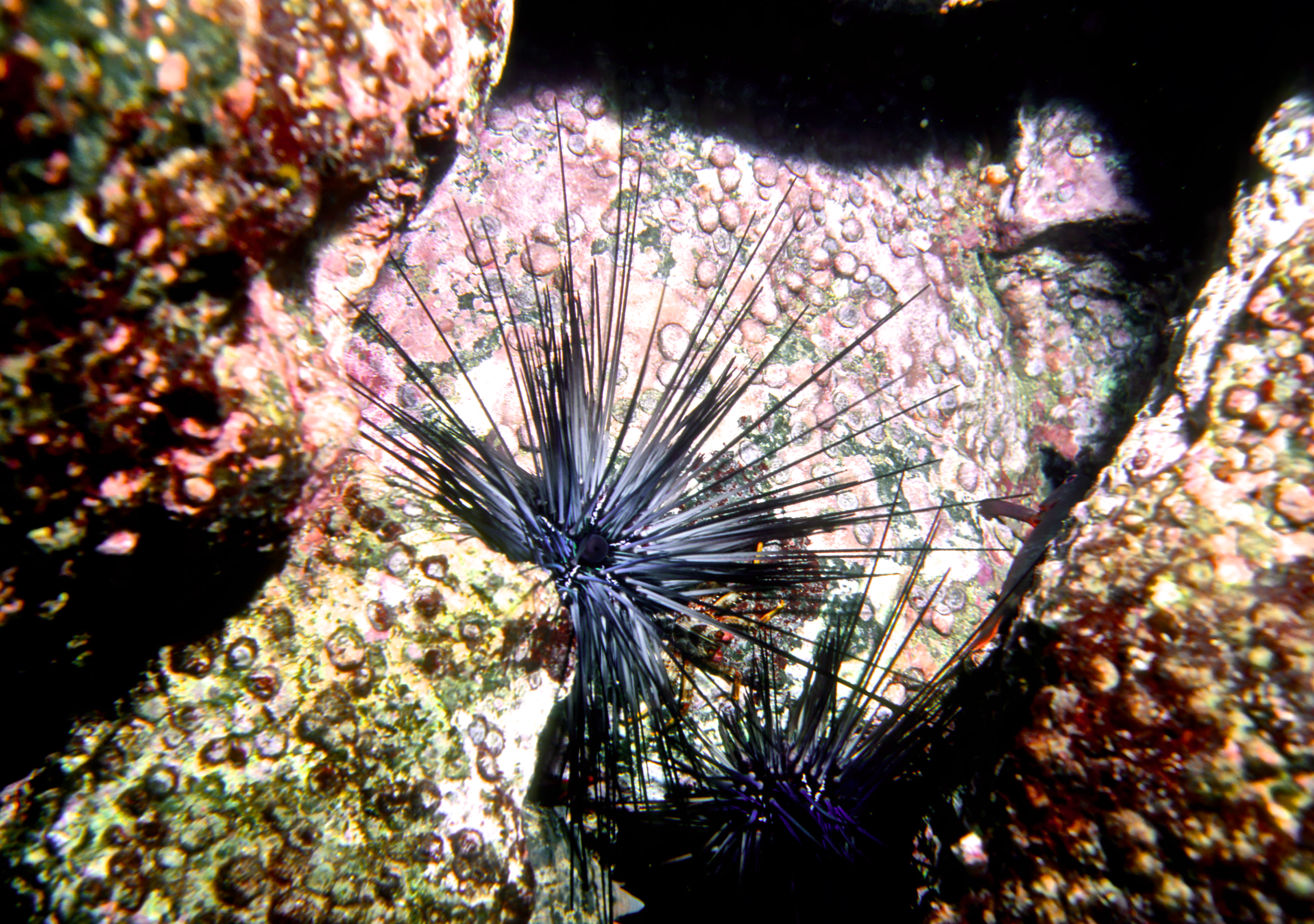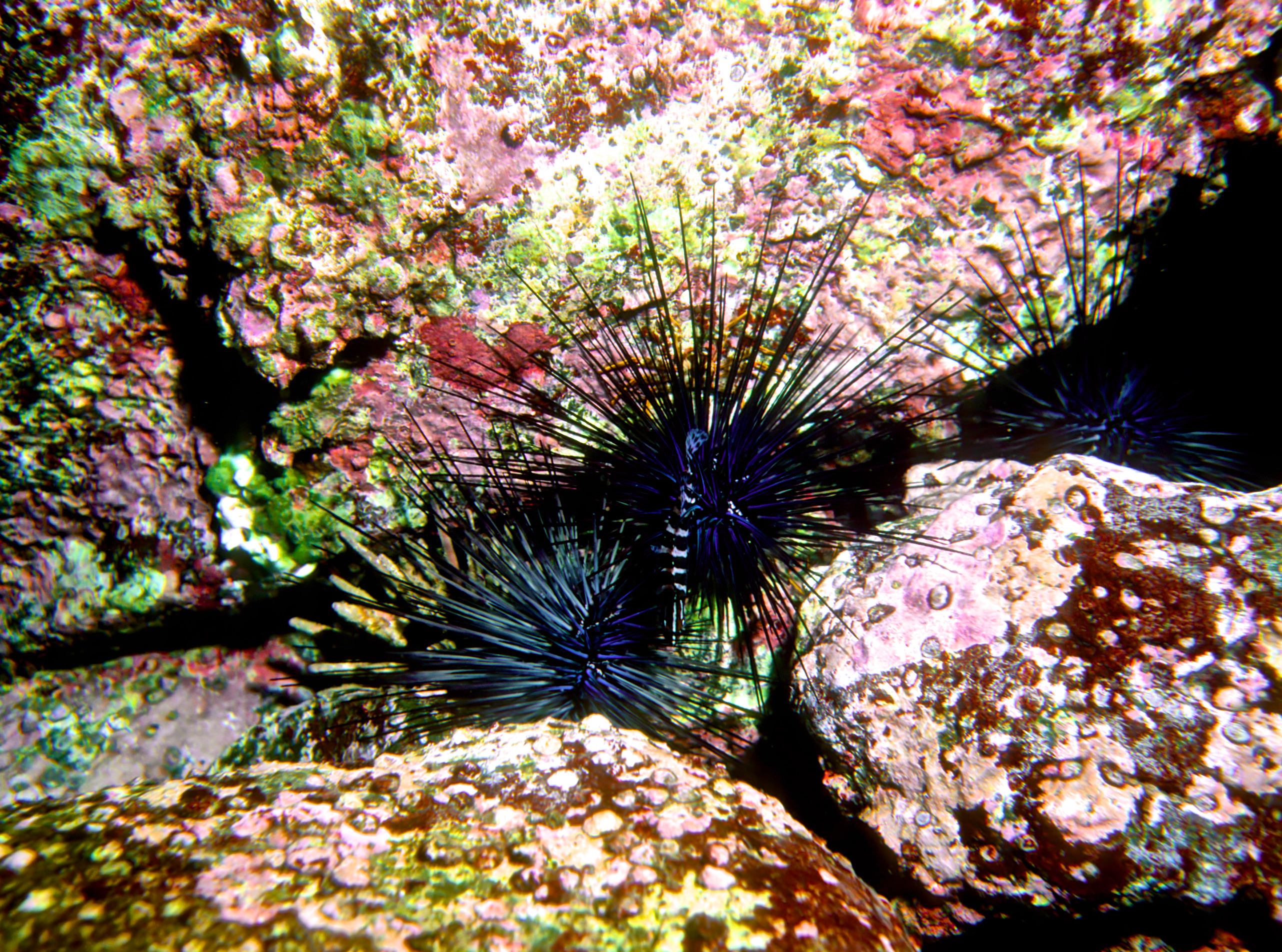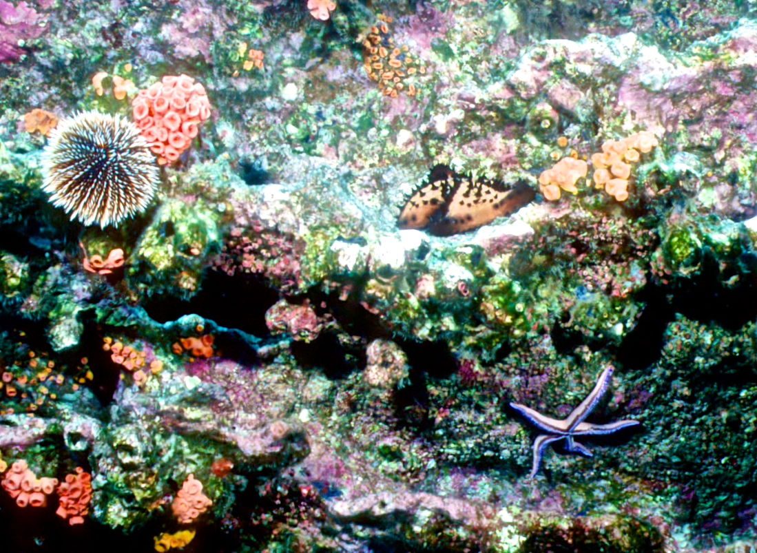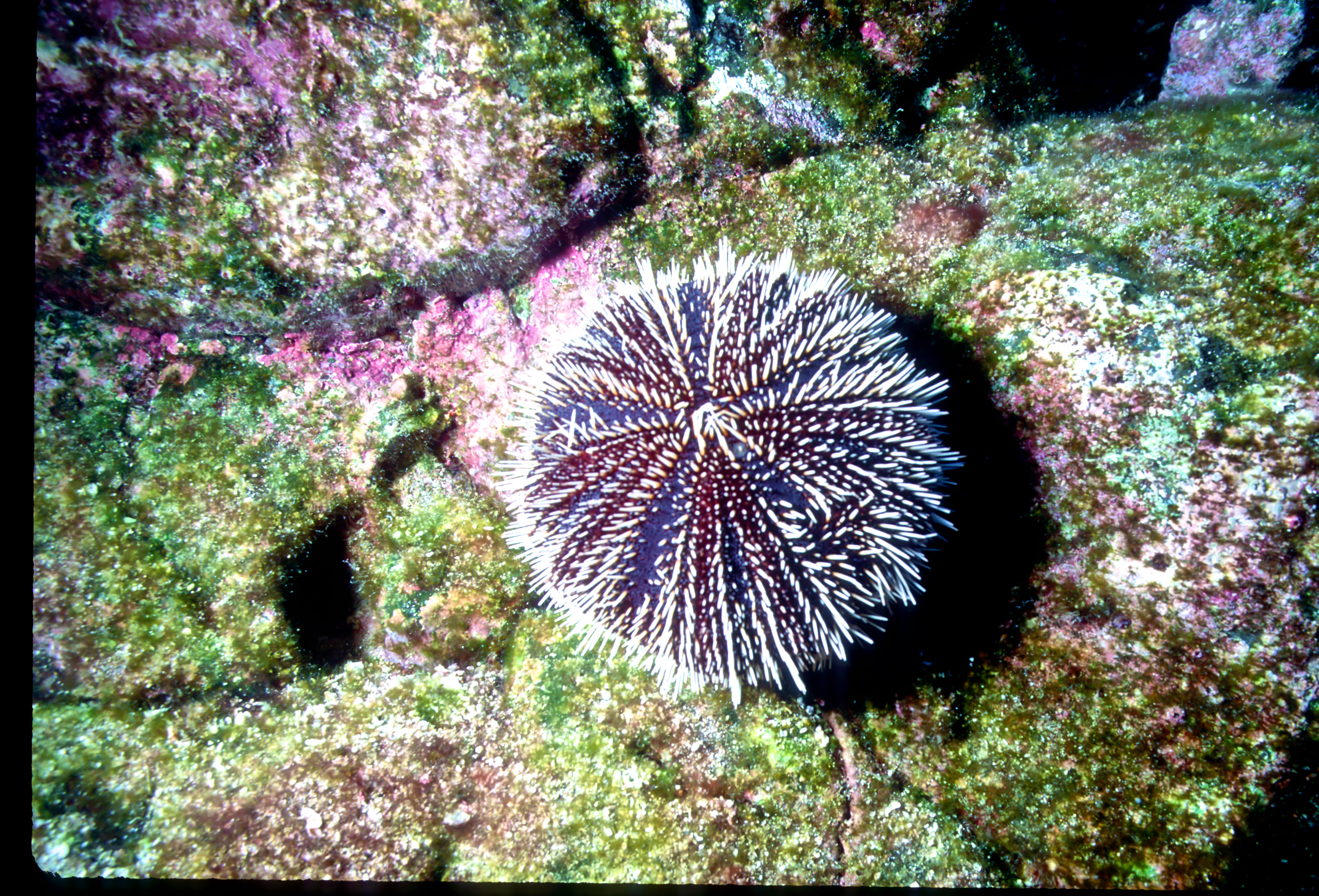 Urchins come in many sizes and colors. We see them best at night. These photos were taken on my dives in the 1990's. /hughClick a photo to view or click first photo to see a slide show.