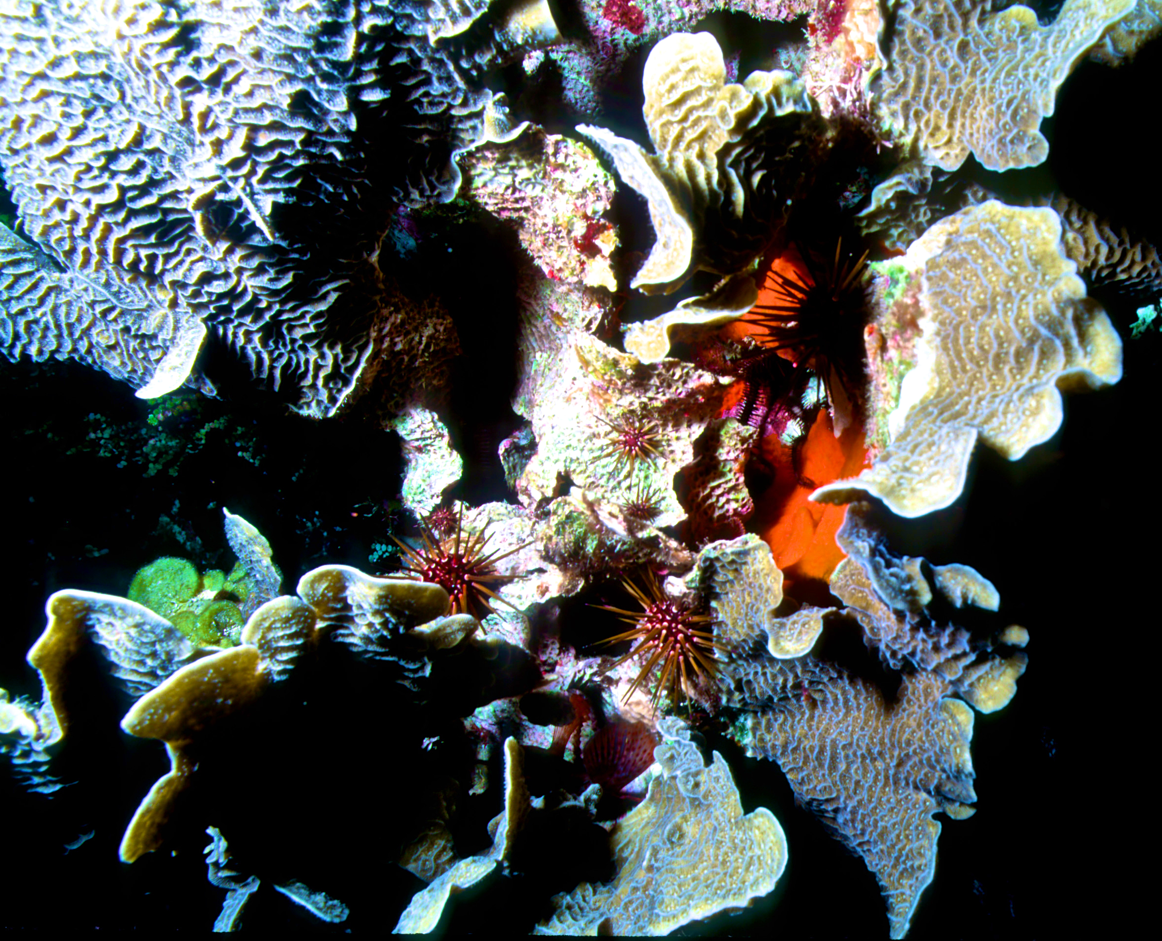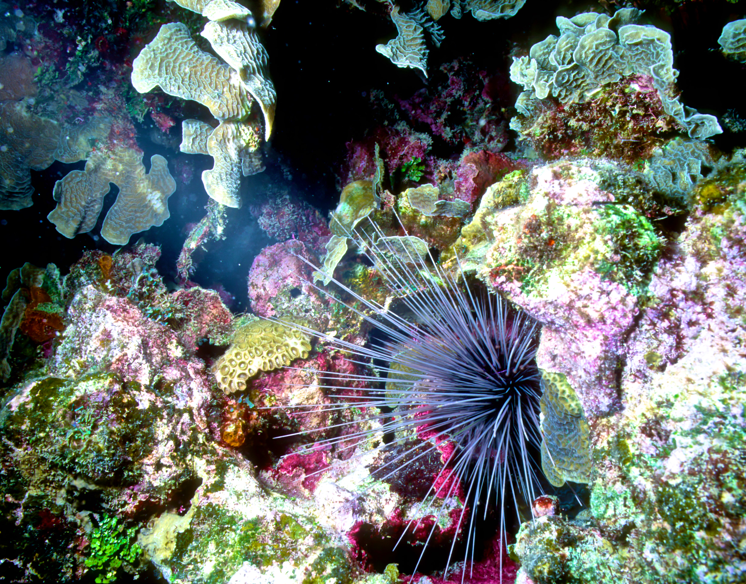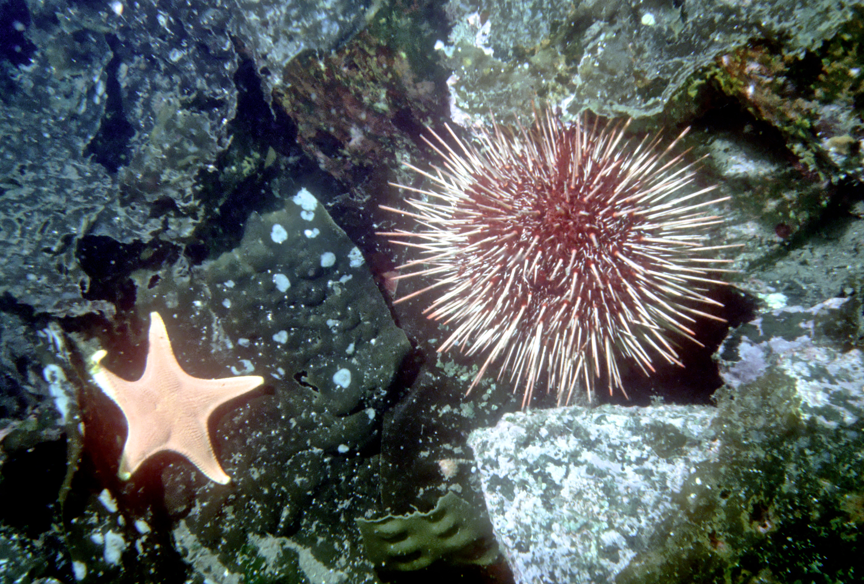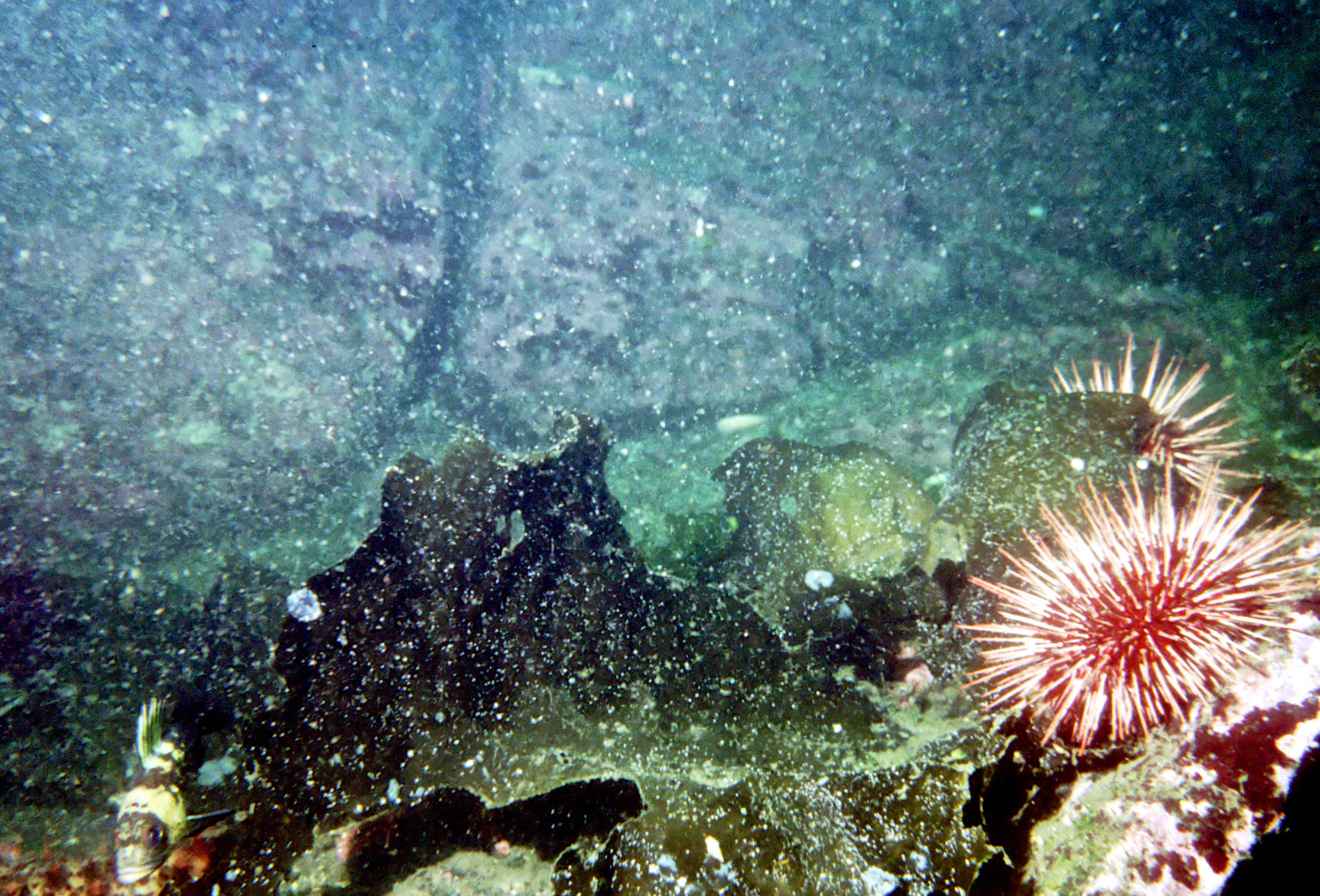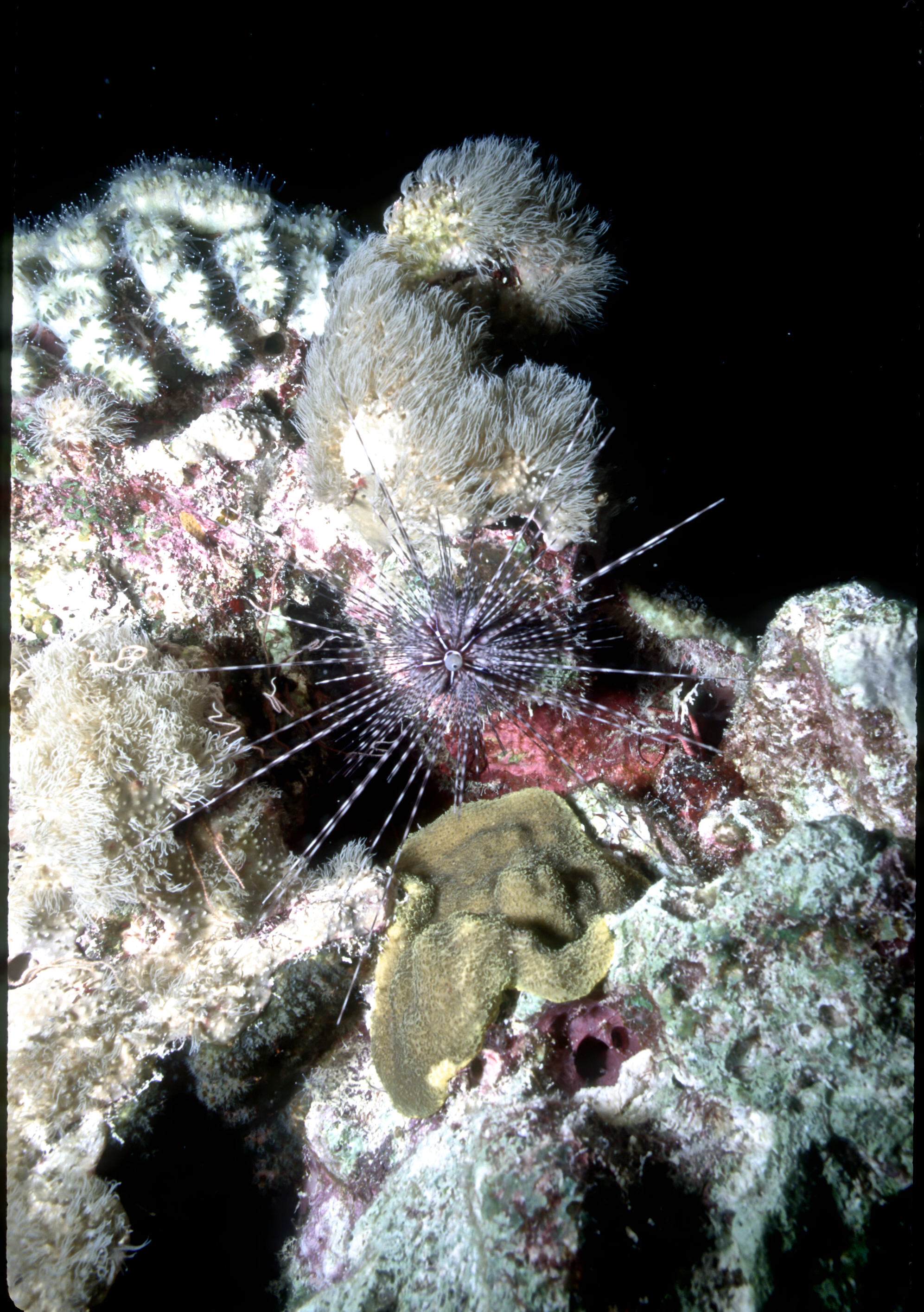 Urchins come in many sizes and colors. We see them best at night. These photos were taken on my dives in the 1990's. /hughClick a photo to view or click first photo to see a slide show.