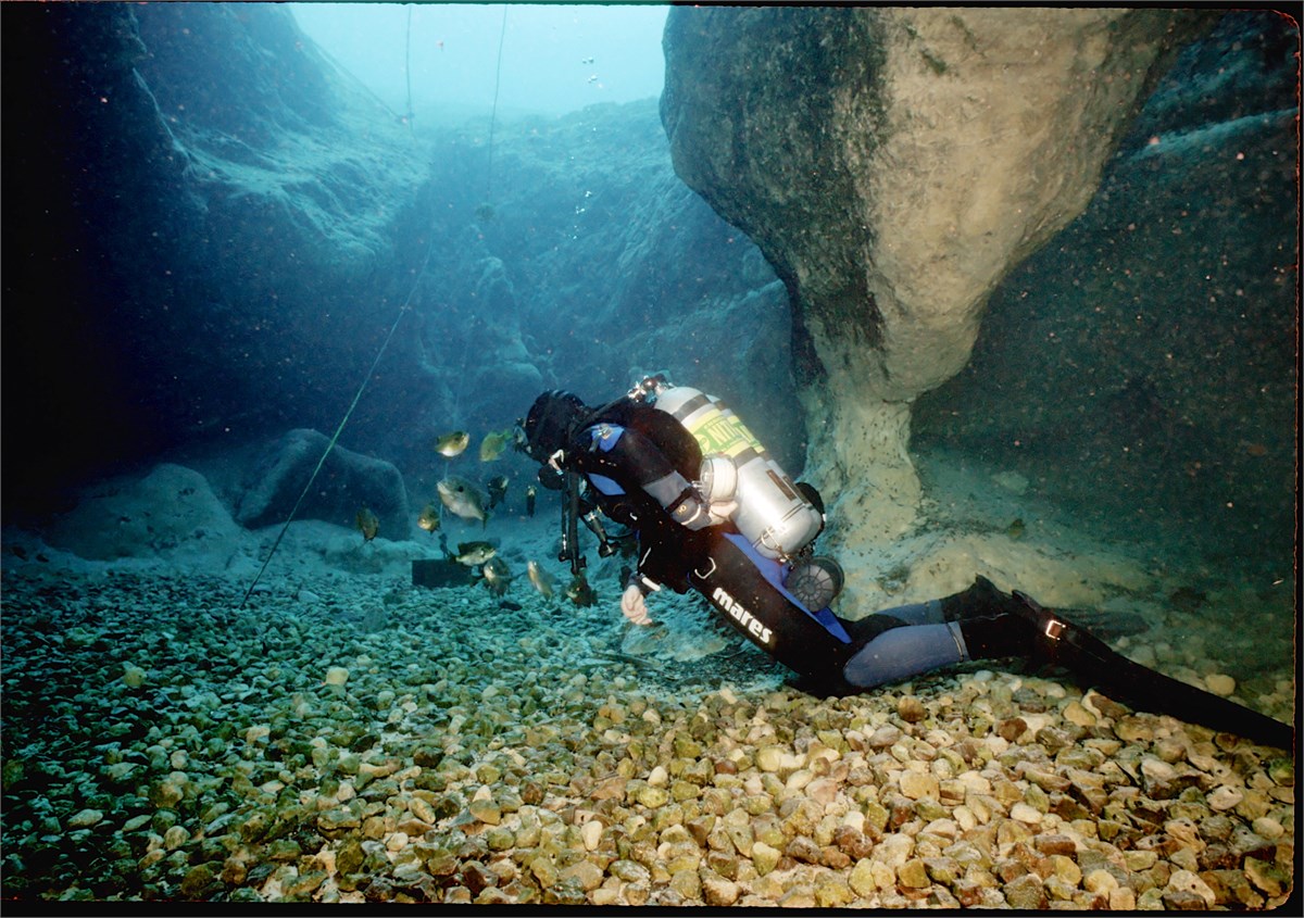 I used my Nikon N70 camera in a Ilelite housing with two Ikelite Ai strobes. The second strobe was used as a slave. Fujichrome Velvia 50 slide film. Trey Barrow is the diver. /hugh