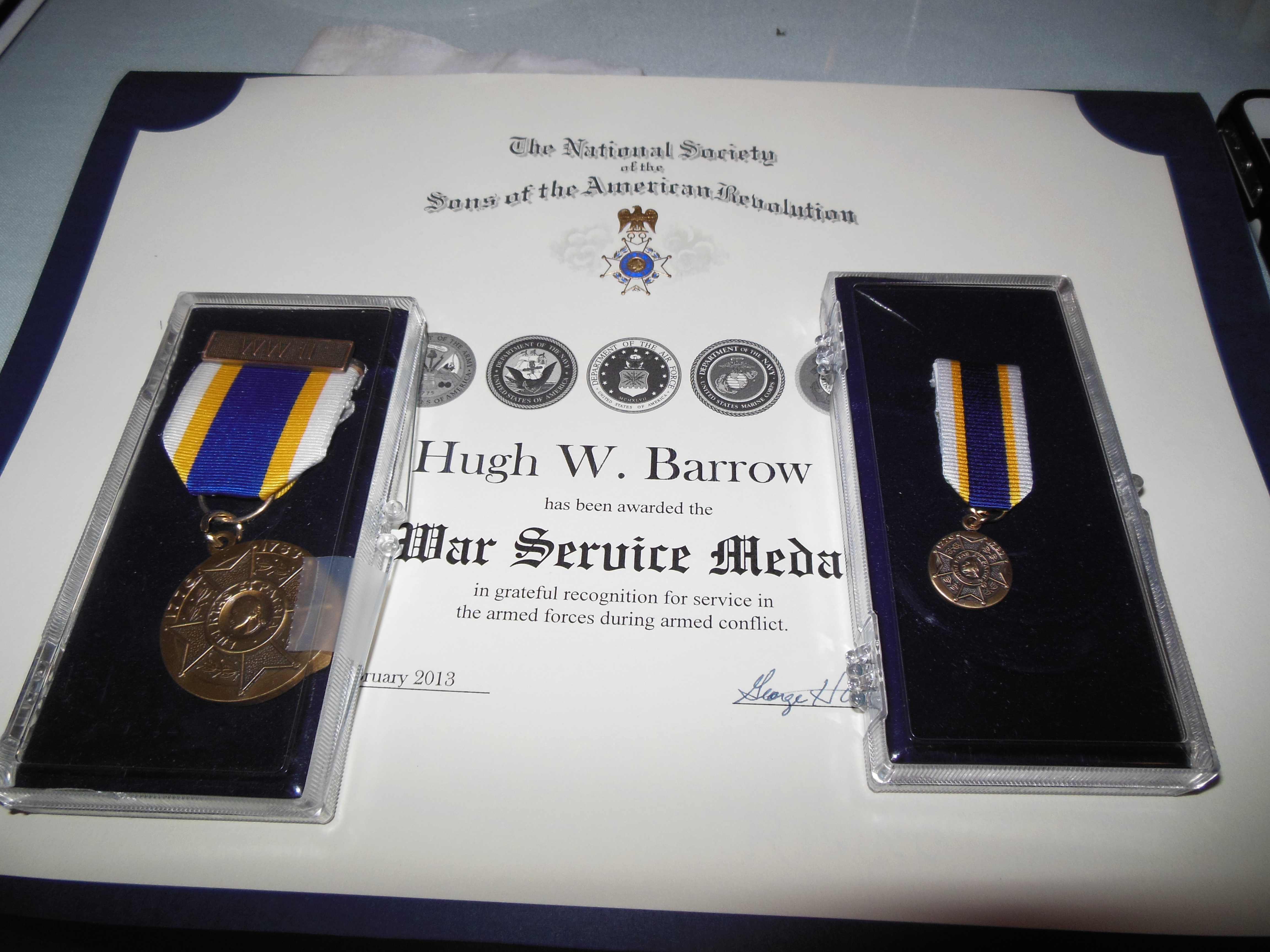 On Saturday, February 23, 2013 at the meeting of the Sons of the American Revolution my father, Hugh Will (Bill) Barrow, Sr. received two awards. One was given as a member who had served in the military and the larger one was for serving in time of war in an active war zone. Congratulations Bill!!! We love you so very much. /hugh