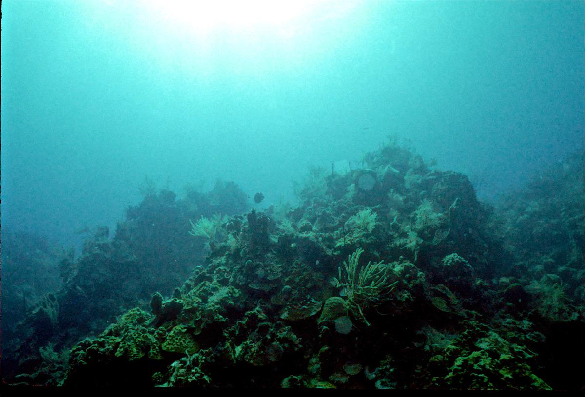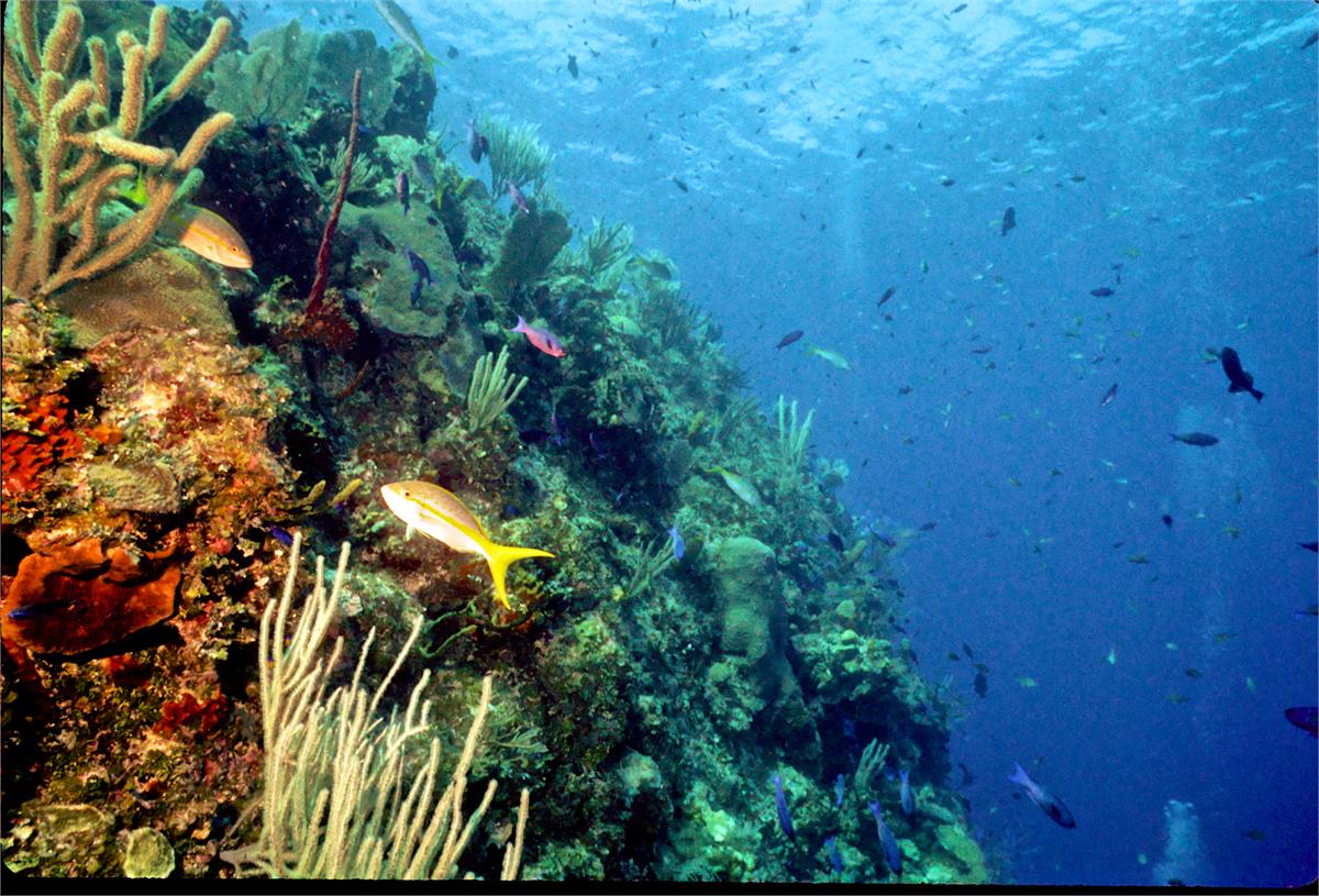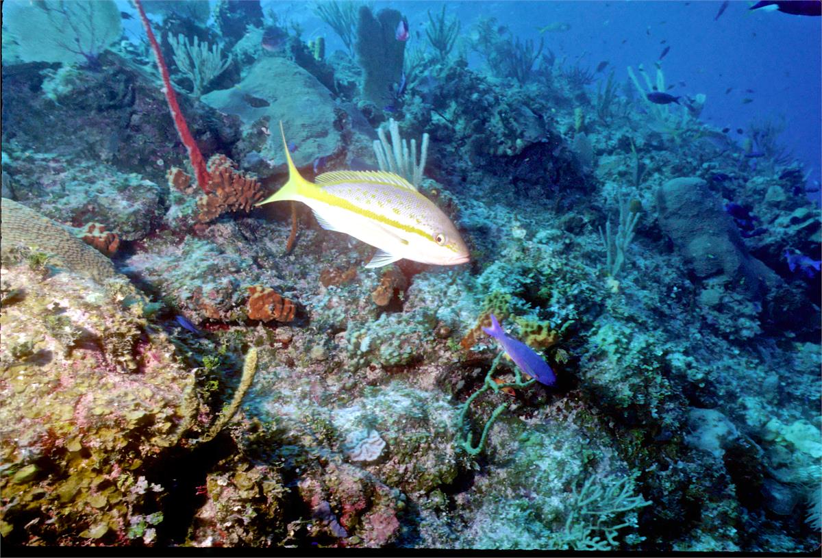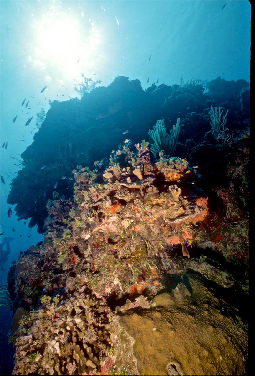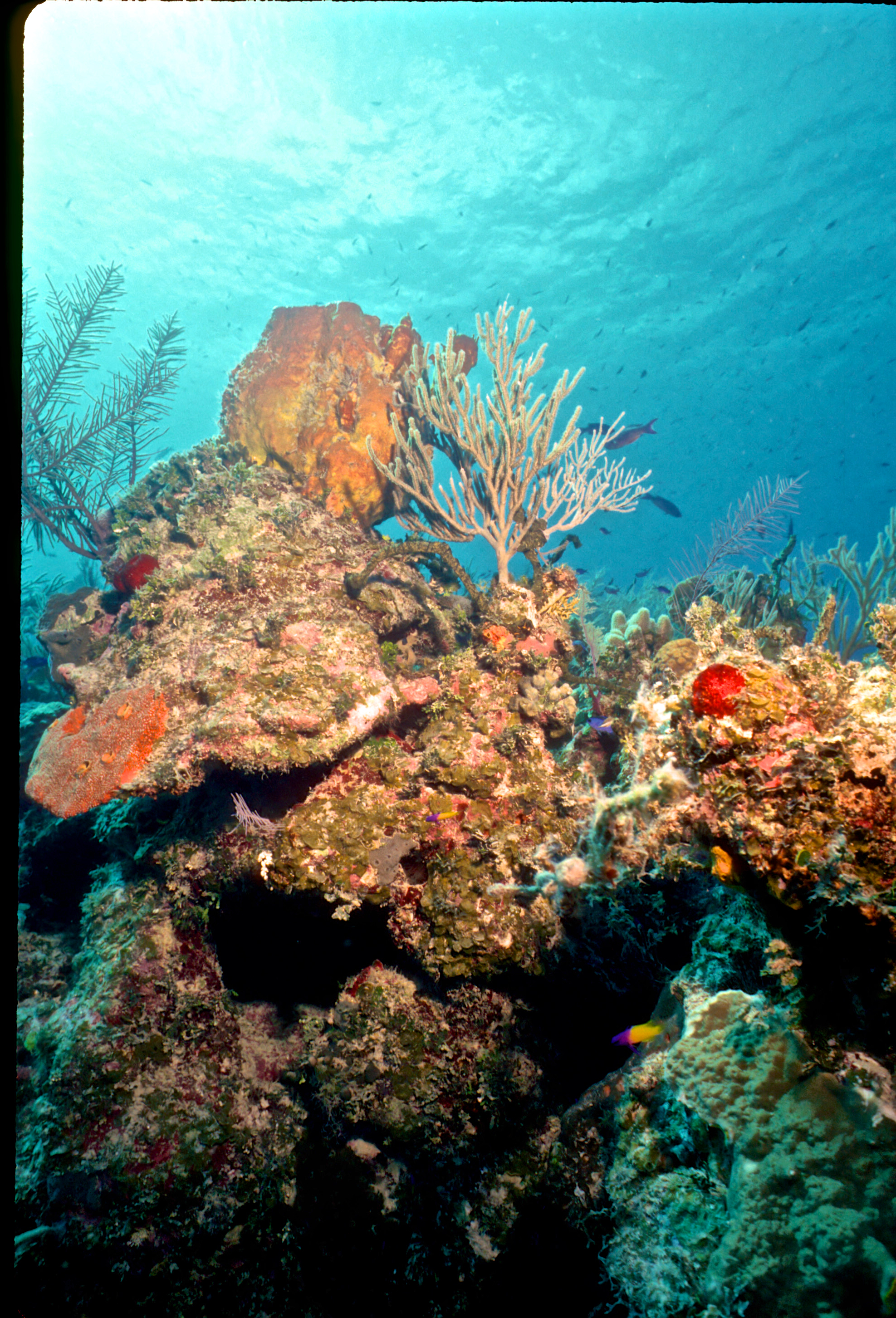 Dive buddy Rob Schlamowitz. Nikonos V, 15 mm lens, single Ikelite Ai storbe. Sensia 200 film. A nice wall edge. Little Cayman in 1997 was a wonderful place to dive. /hughClick a photo to view or click first photo to see a slide show.