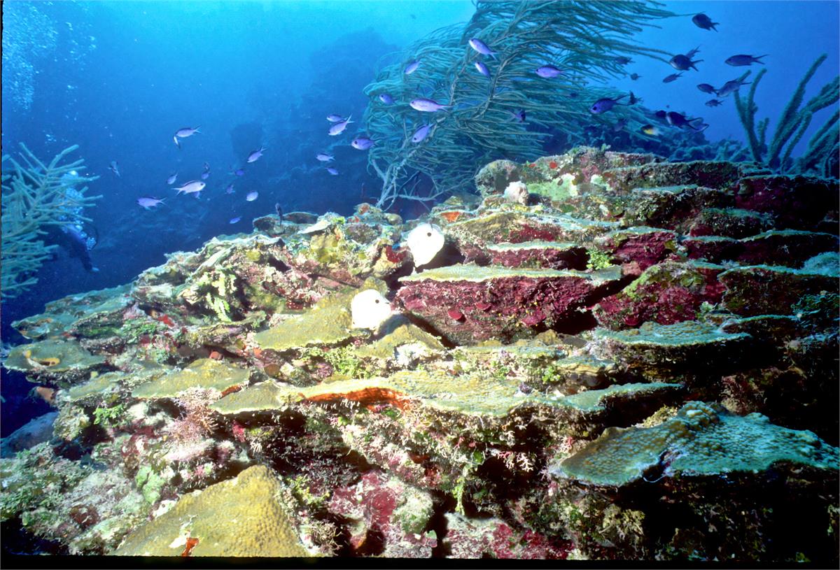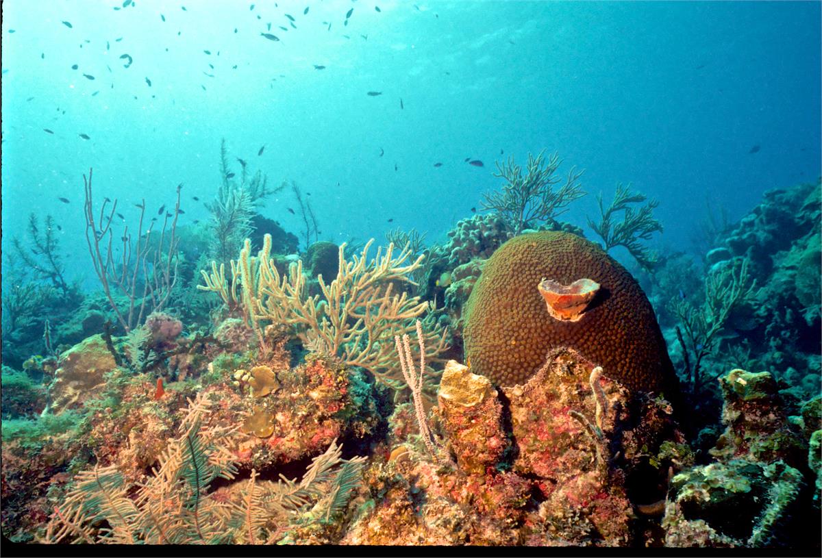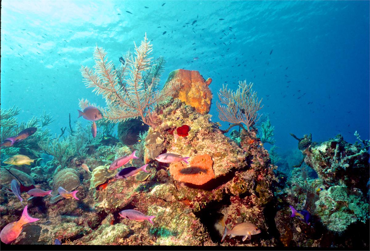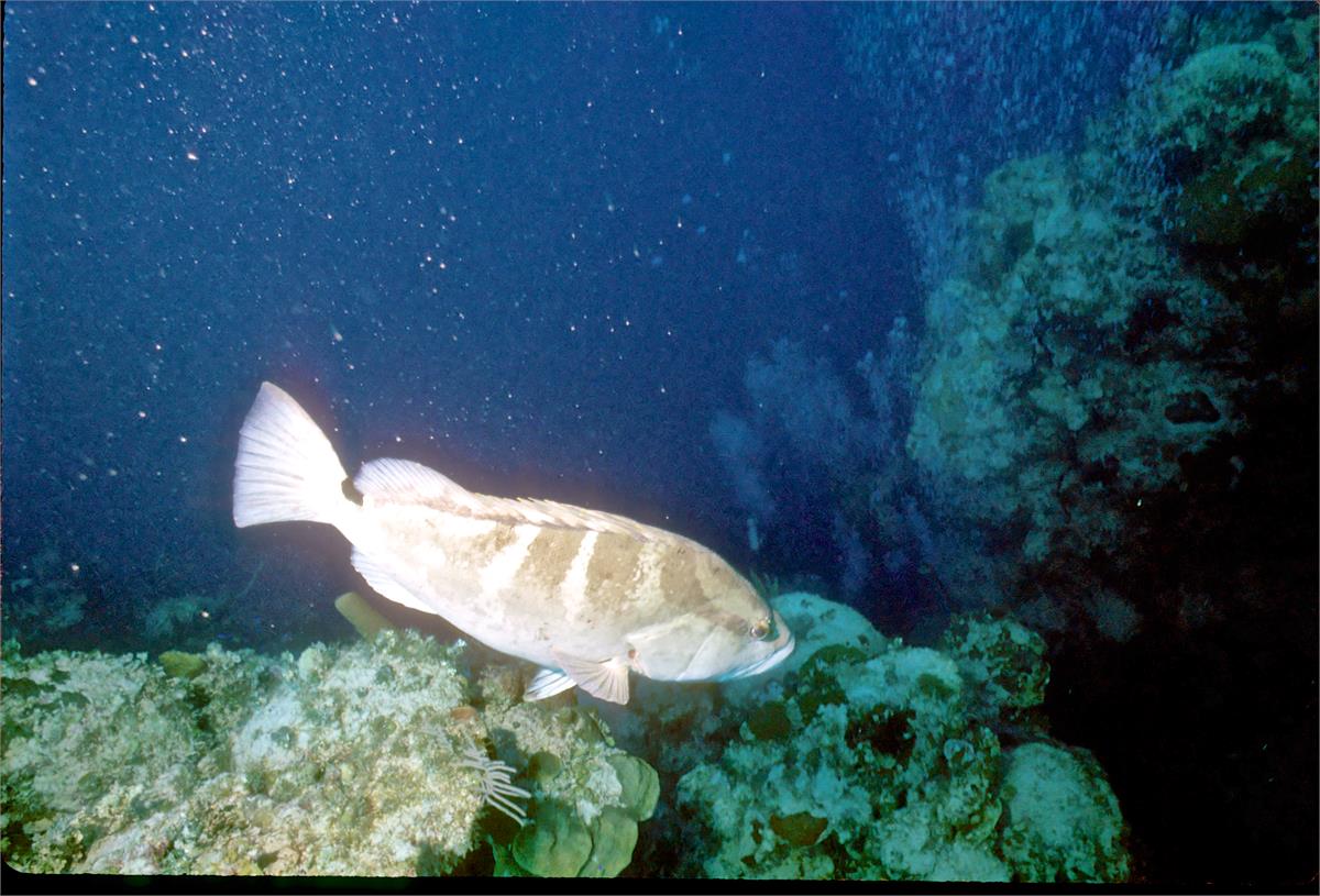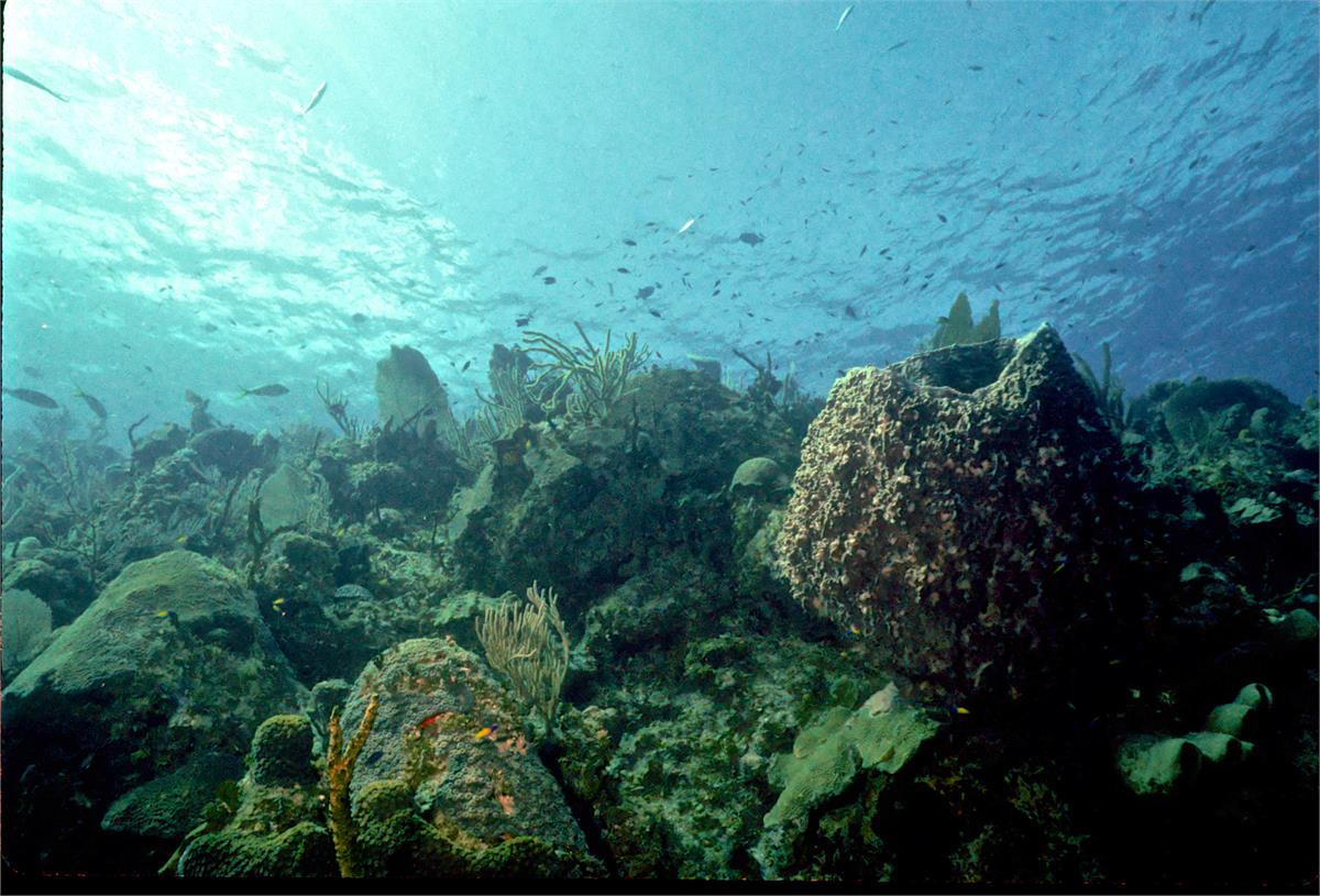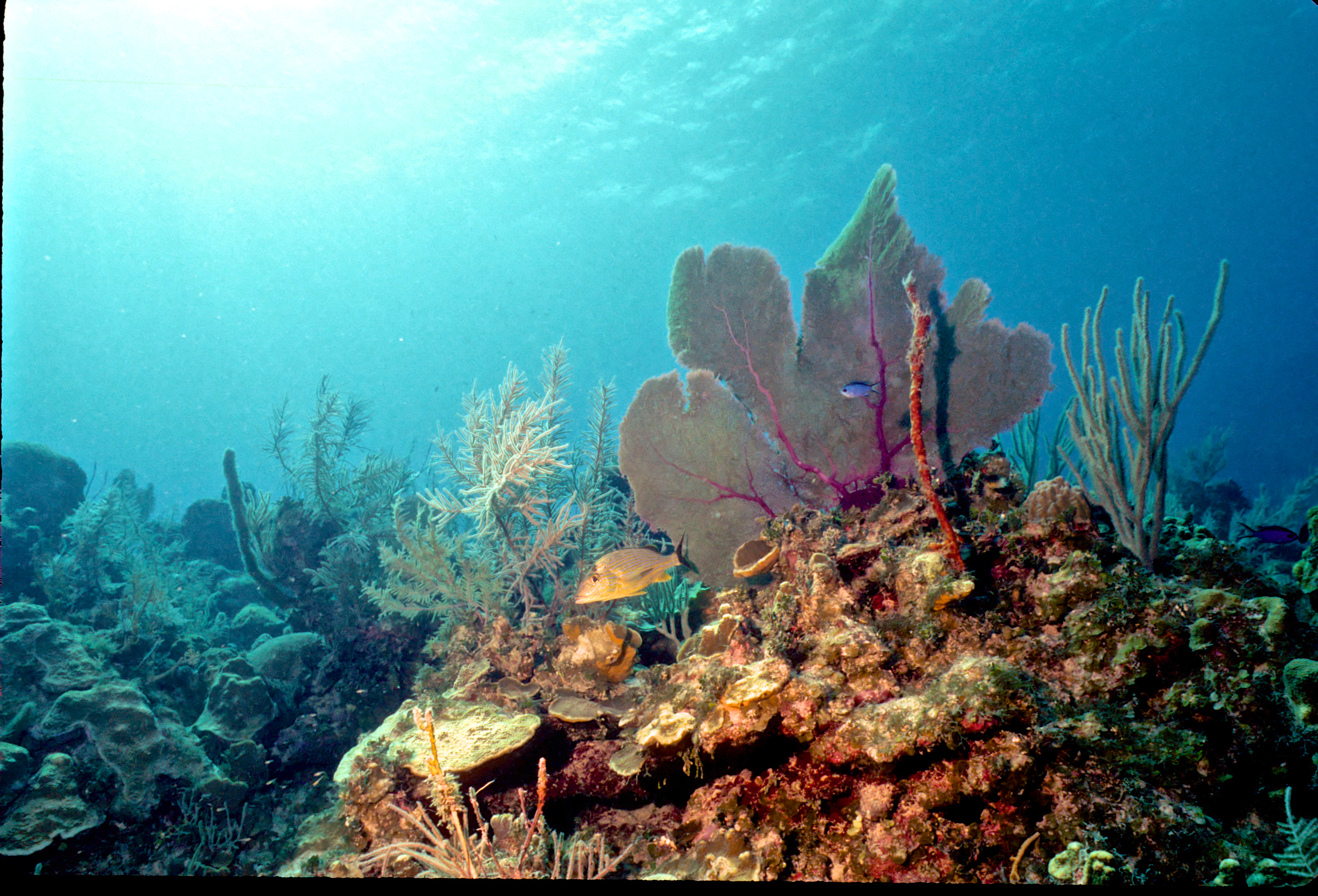 Dive buddy Rob Schlamowitz. Nikonos V, 15 mm lens, single Ikelite Ai storbe. Sensia 200 film. A nice wall edge. Little Cayman in 1997 was a wonderful place to dive. /hughClick a photo to view or click first photo to see a slide show.