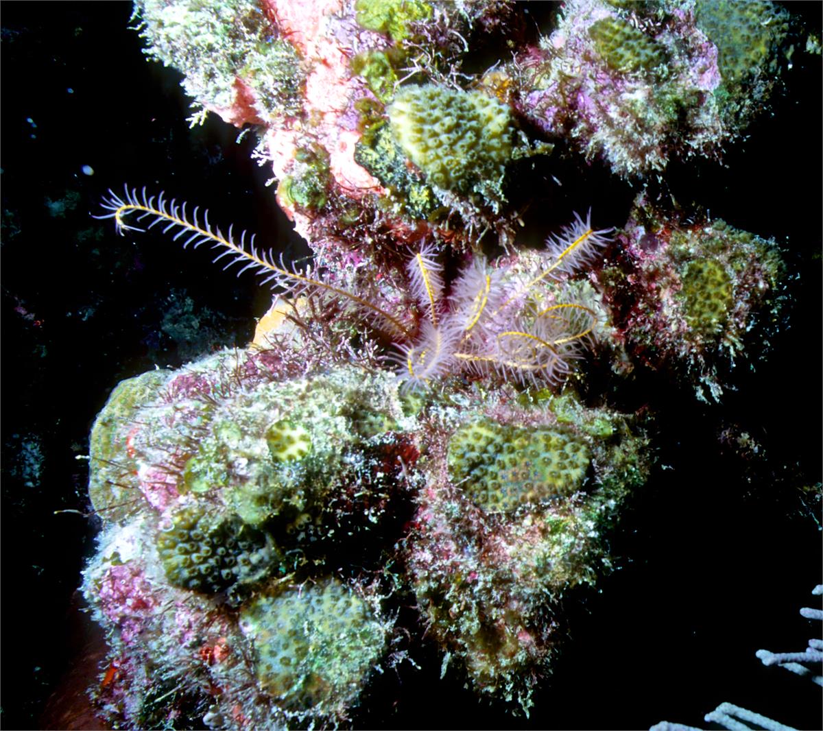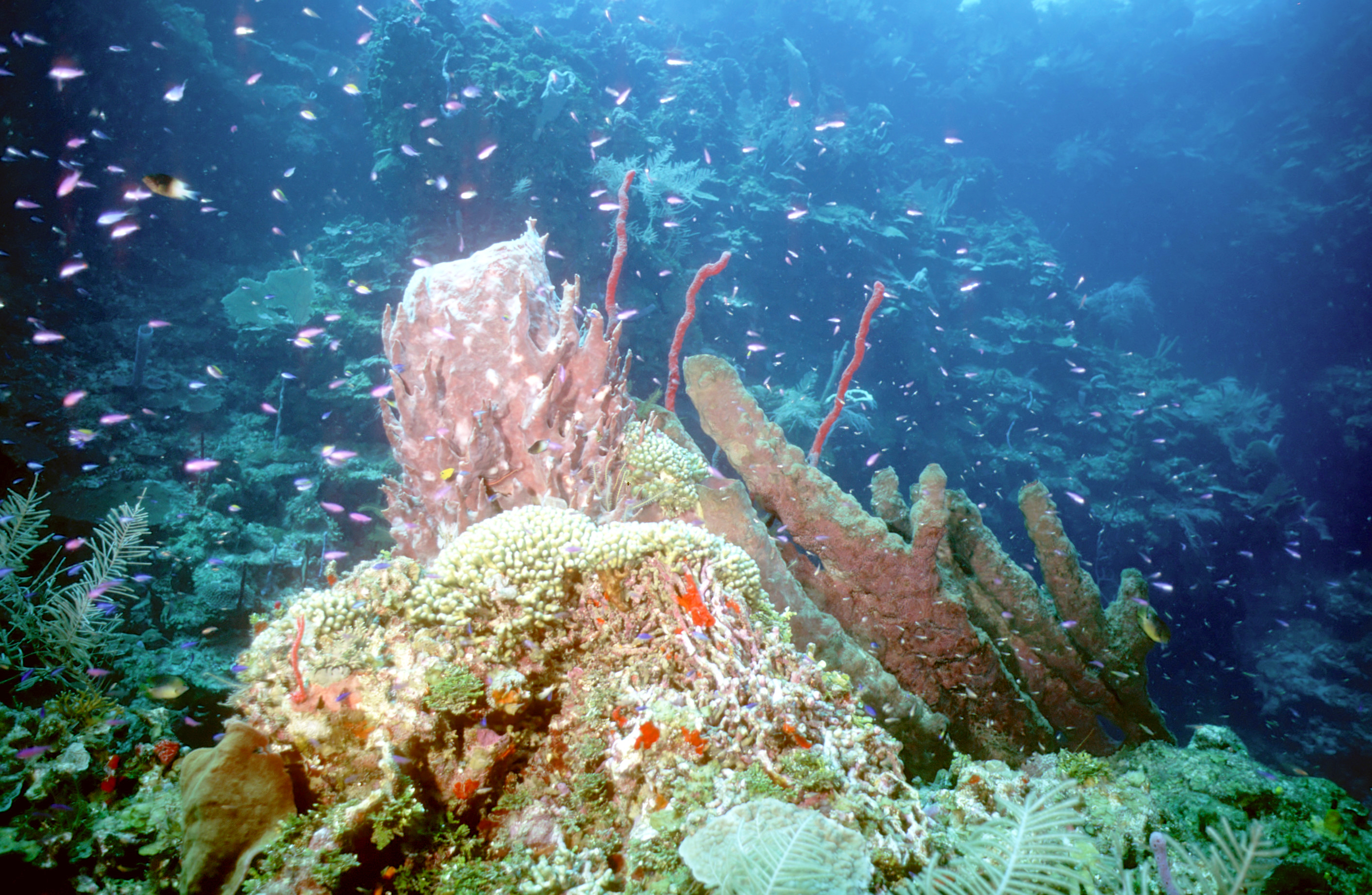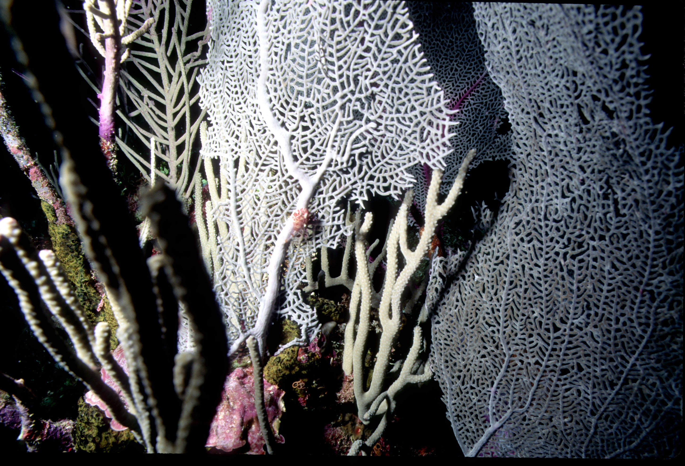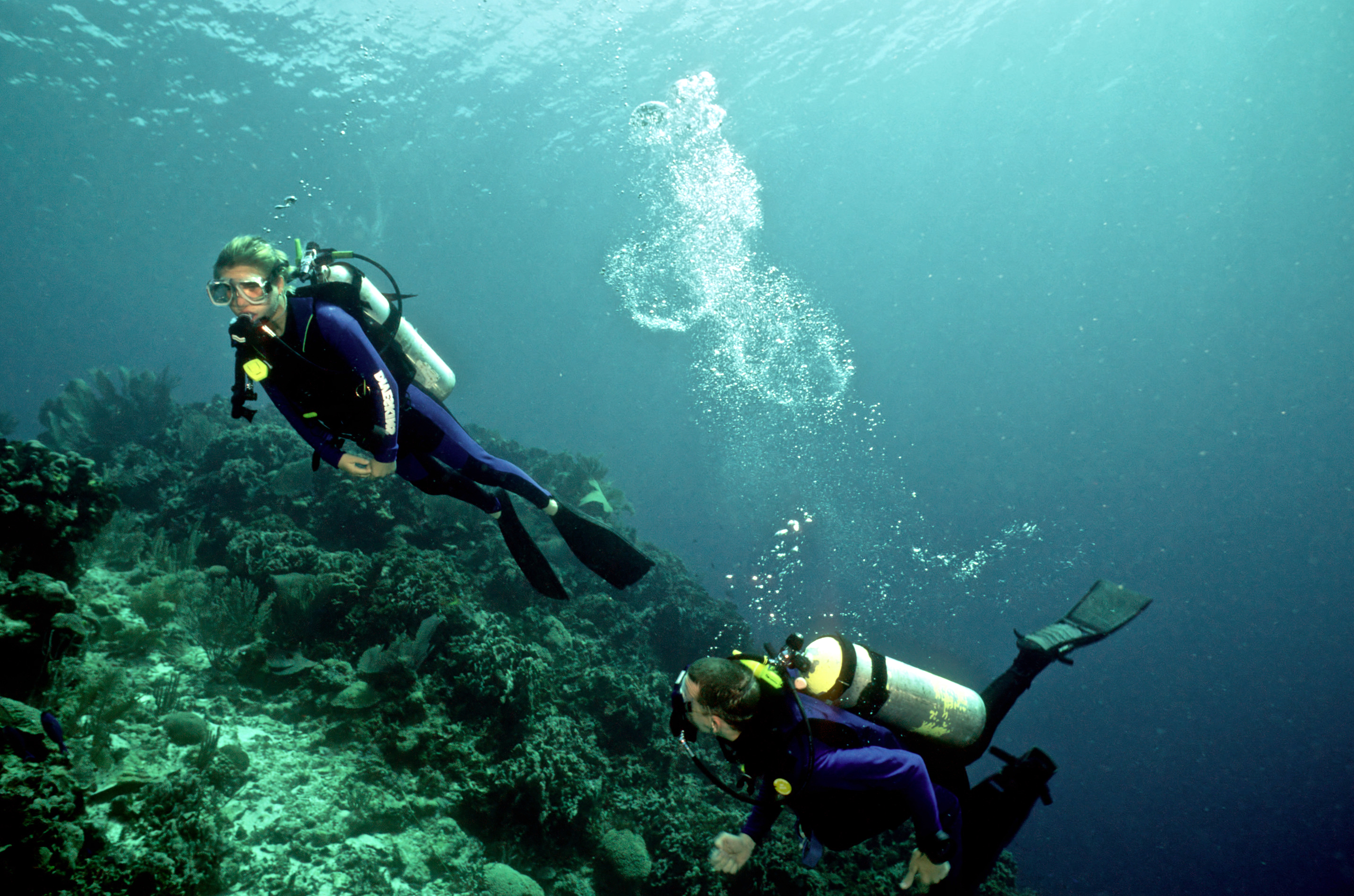 Dive buddies Lori and Trey. Nikonos V, 15 mm lens, single Ikelite Ai storbe. Velvia 50 film. Two dives at this site. We saw a corallimorph and a cleaner shrimp on a vase sponge. A beautiful day! /hugh